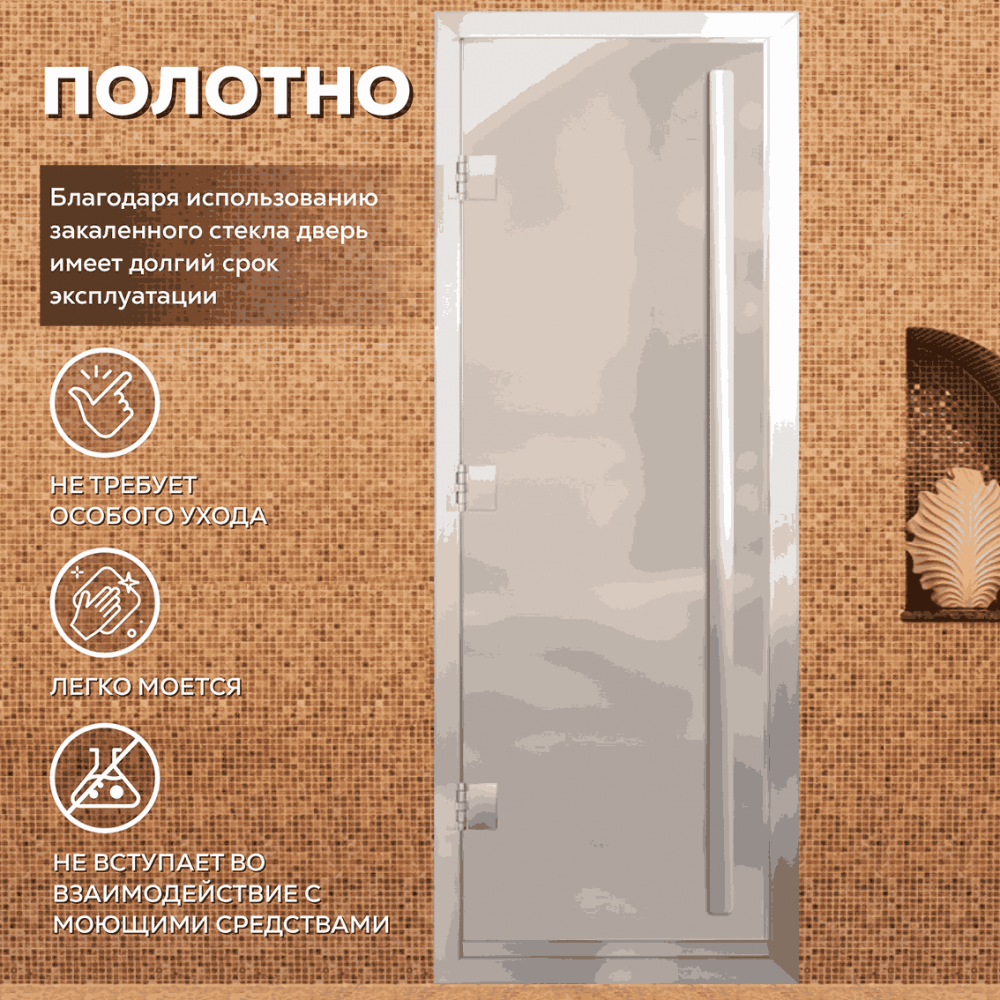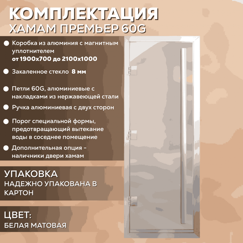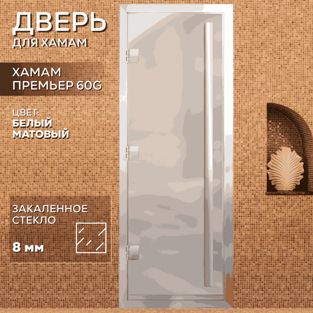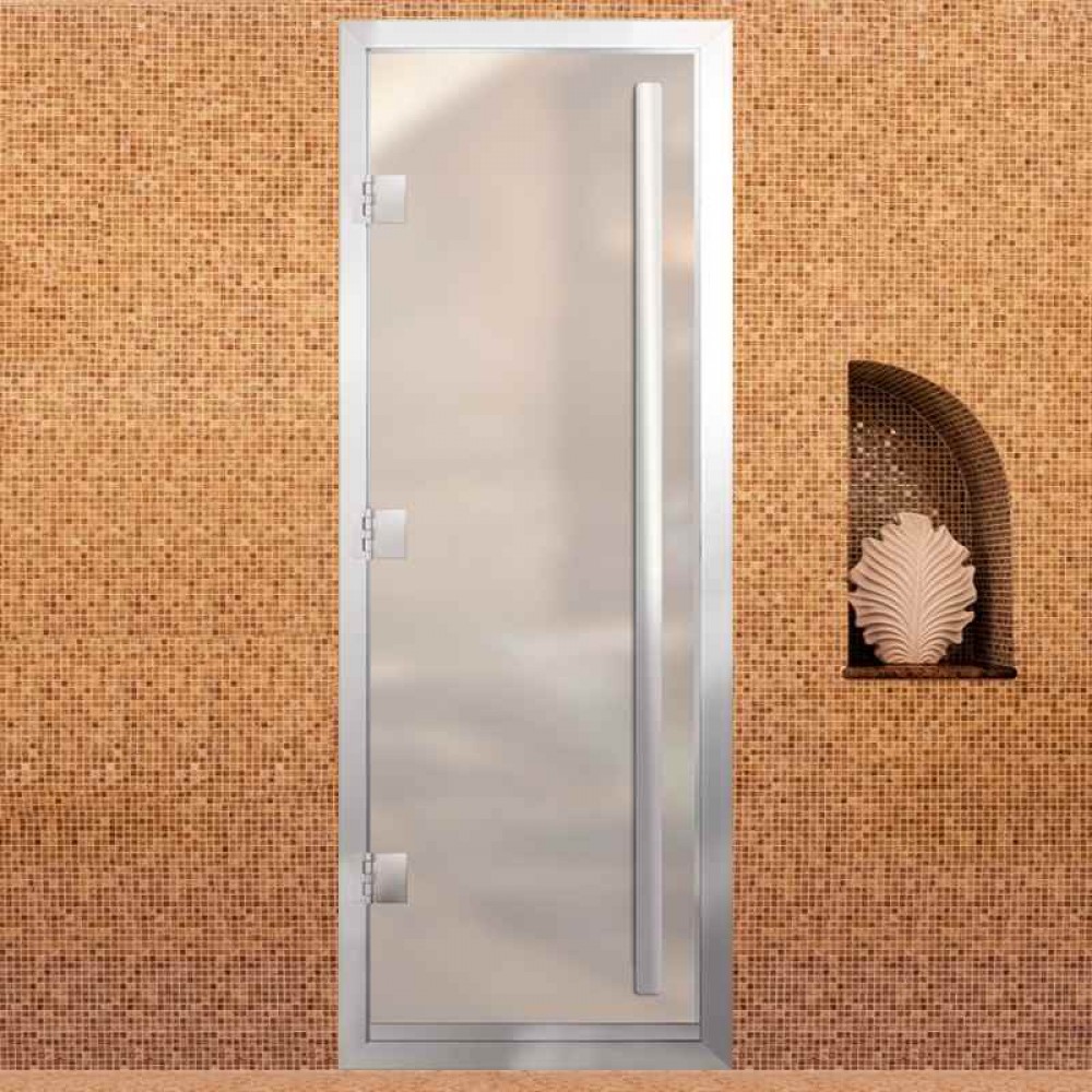 Дверь для хаммама АРТА Премьер 60G – отличное решение для помещений с повышенной влажностью (турецкой парной, душевой, бассейна), где пластик не выдерживает высокую температуру, а дерево разбухает и гниет от влаги. Все дверные полотна изготовлены из надёжного закаленного стекла 8 мм, благодаря применяемым технологиям это стекло абсолютно безопасно. Коробка выполнена из анодированного алюминиевого профиля, а специальный магнитный уплотнитель позволяет мягко и плотно закрываться двери даже если на нее попала вода.Предусмотрен порог, предохраняющий от протечки воды в соседние помещения, зазор для вентиляции в нижней части двери. В комплектации предусмотрена вертикальная ручка.