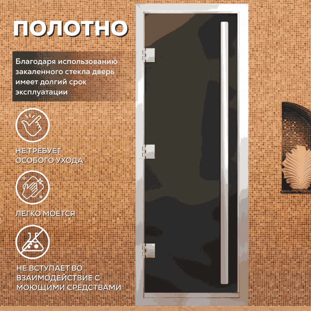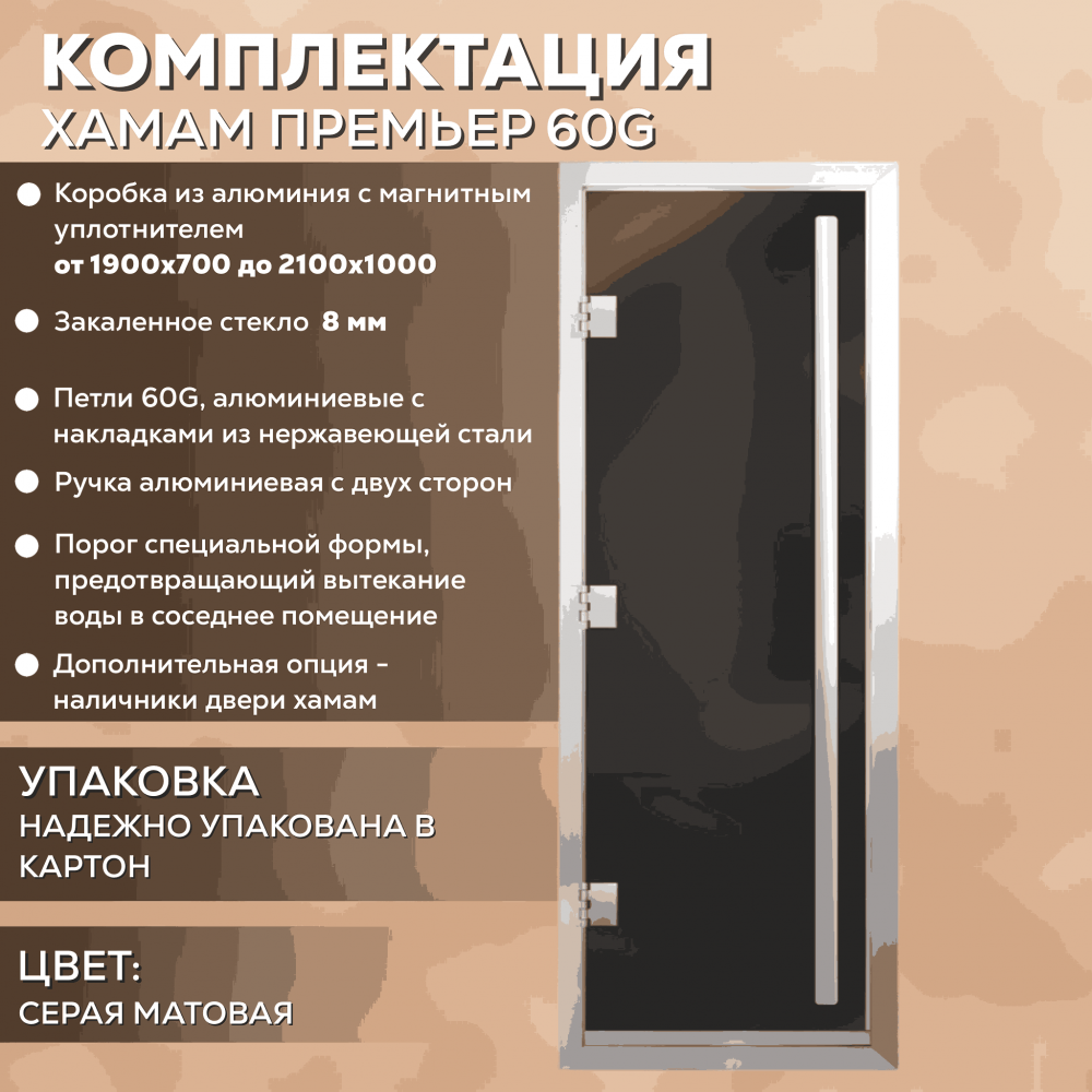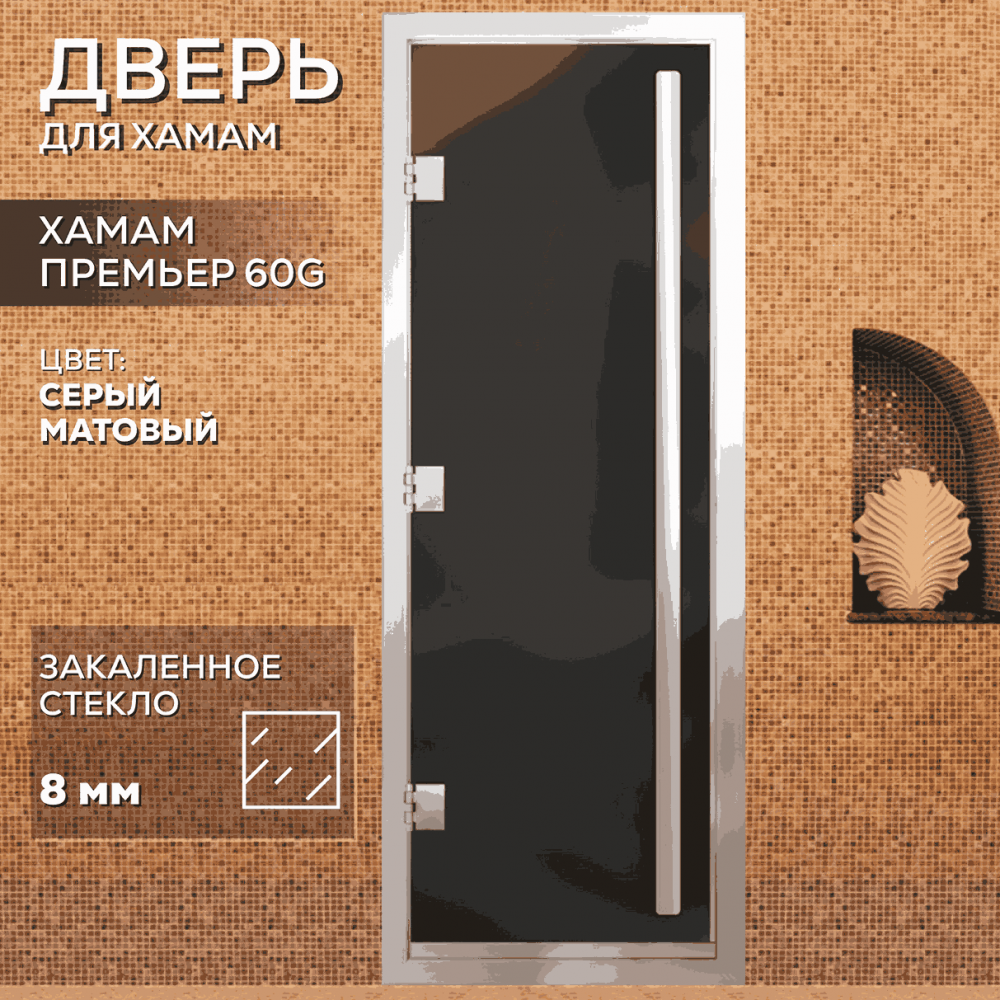 Дверь для хаммама АРТА Премьер 60G – отличное решение для помещений с повышенной влажностью (турецкой парной, душевой, бассейна), где пластик не выдерживает высокую температуру, а дерево разбухает и гниет от влаги. Все дверные полотна изготовлены из надёжного закаленного стекла 8 мм, благодаря применяемым технологиям это стекло абсолютно безопасно. Коробка выполнена из анодированного алюминиевого профиля, а специальный магнитный уплотнитель позволяет мягко и плотно закрываться двери даже если на нее попала вода.Предусмотрен порог, предохраняющий от протечки воды в соседние помещения, зазор для вентиляции в нижней части двери. В комплектации предусмотрена вертикальная ручка.