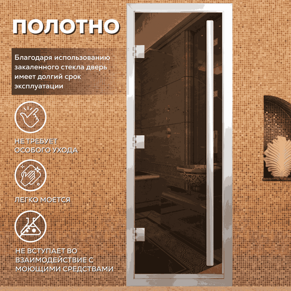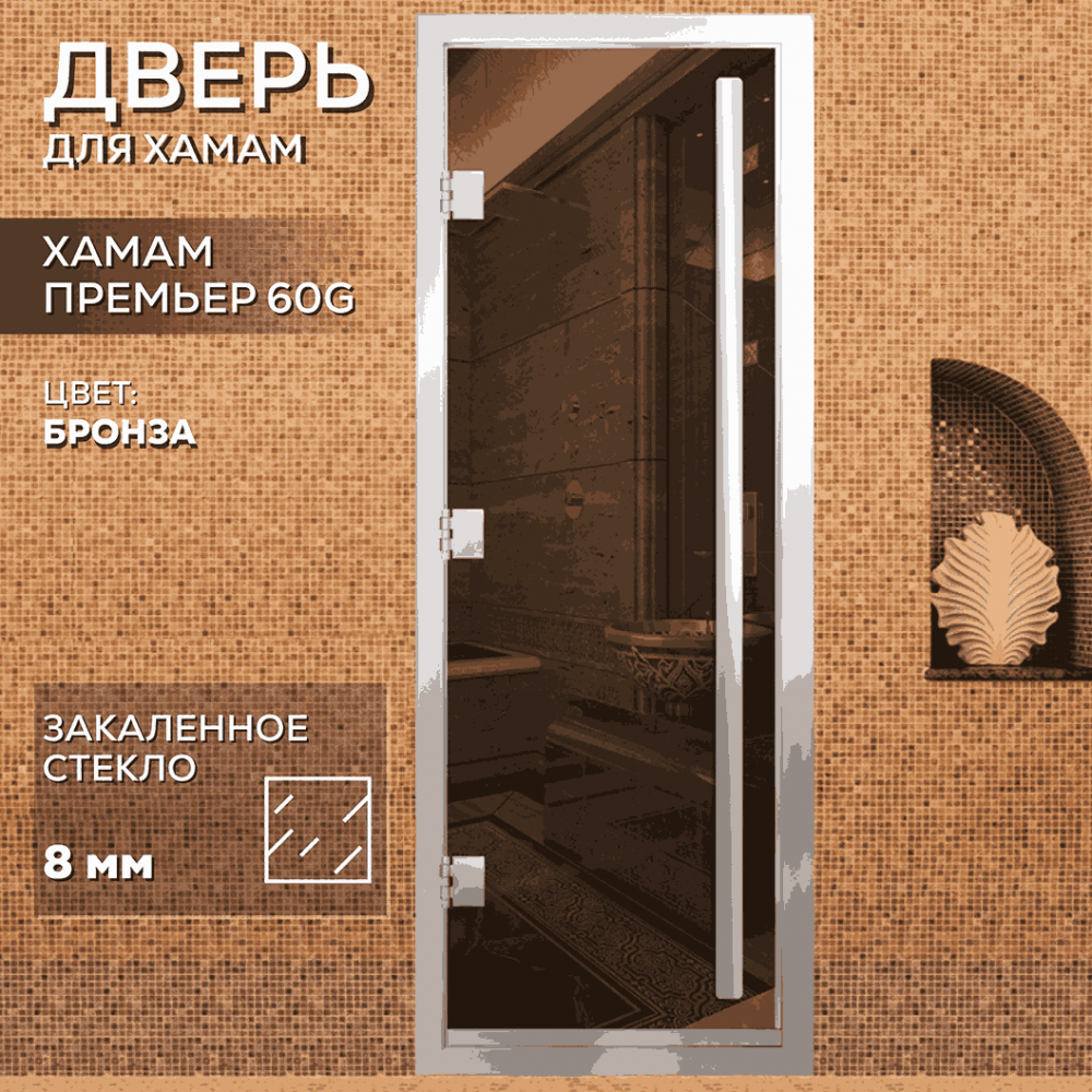 Дверь для хаммама АРТА Премьер 60G – отличное решение для помещений с повышенной влажностью (турецкой парной, душевой, бассейна), где пластик не выдерживает высокую температуру, а дерево разбухает и гниет от влаги. Все дверные полотна изготовлены из надёжного закаленного стекла 8 мм, благодаря применяемым технологиям это стекло абсолютно безопасно. Коробка выполнена из анодированного алюминиевого профиля, а специальный магнитный уплотнитель позволяет мягко и плотно закрываться двери даже если на нее попала вода.Предусмотрен порог, предохраняющий от протечки воды в соседние помещения, зазор для вентиляции в нижней части двери. В комплектации предусмотрена вертикальная ручка.