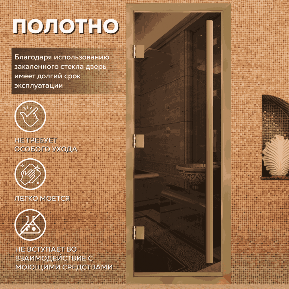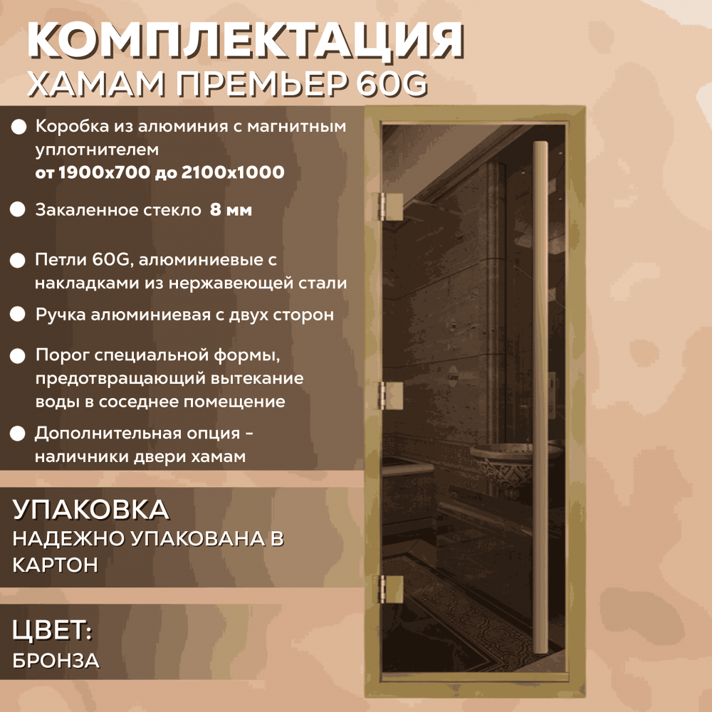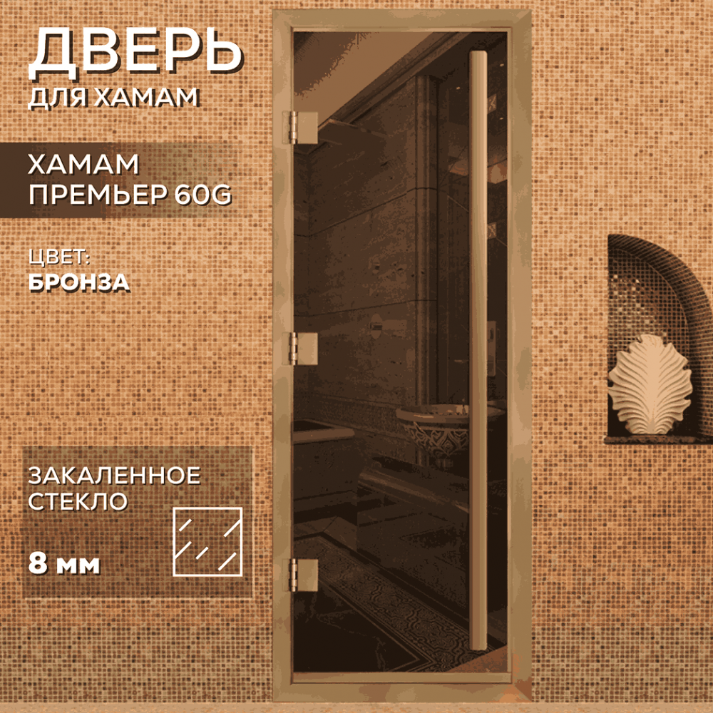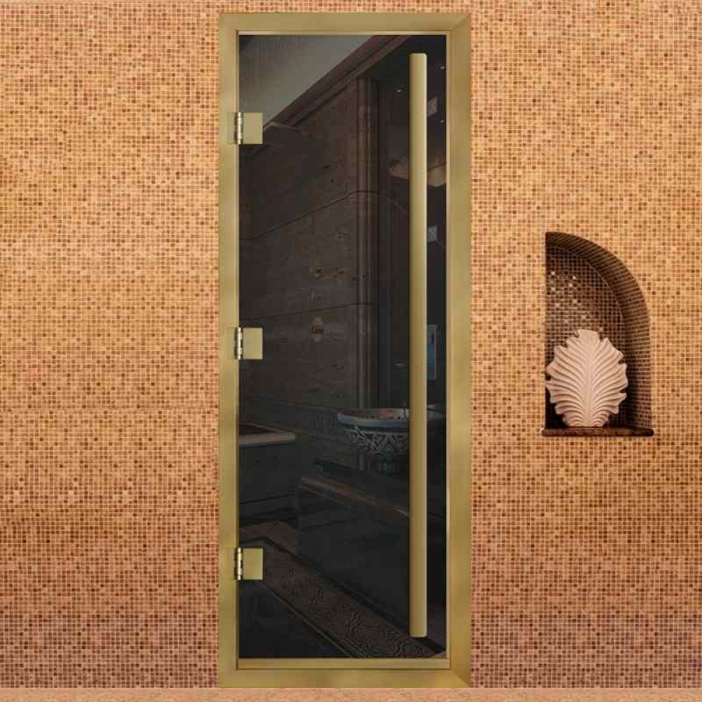 Дверь для хаммама АРТА Премьер 60G – отличное решение для помещений с повышенной влажностью (турецкой парной, душевой, бассейна), где пластик не выдерживает высокую температуру, а дерево разбухает и гниет от влаги. Все дверные полотна изготовлены из надёжного закаленного стекла 8 мм, благодаря применяемым технологиям это стекло абсолютно безопасно. Коробка выполнена из анодированного алюминиевого профиля, а специальный магнитный уплотнитель позволяет мягко и плотно закрываться двери даже если на нее попала вода.Предусмотрен порог, предохраняющий от протечки воды в соседние помещения, зазор для вентиляции в нижней части двери. В комплектации предусмотрена вертикальная ручка.