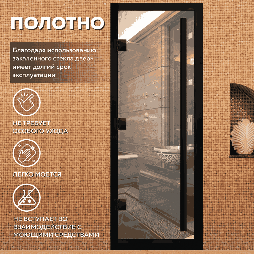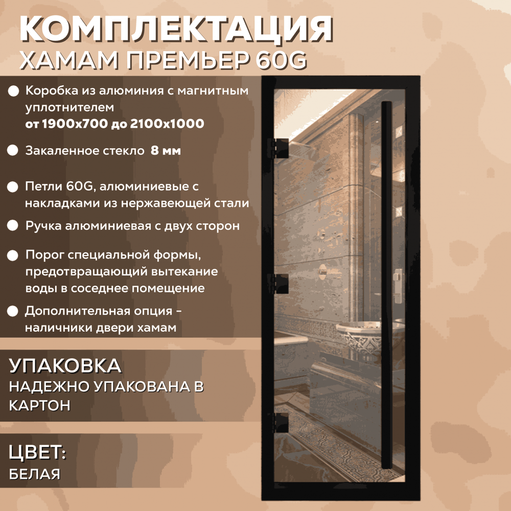 Дверь для хаммама АРТА Премьер 60G – отличное решение для помещений с повышенной влажностью (турецкой парной, душевой, бассейна), где пластик не выдерживает высокую температуру, а дерево разбухает и гниет от влаги. Все дверные полотна изготовлены из надёжного закаленного стекла 8 мм, благодаря применяемым технологиям это стекло абсолютно безопасно. Коробка выполнена из анодированного алюминиевого профиля, а специальный магнитный уплотнитель позволяет мягко и плотно закрываться двери даже если на нее попала вода.Предусмотрен порог, предохраняющий от протечки воды в соседние помещения, зазор для вентиляции в нижней части двери. В комплектации предусмотрена вертикальная ручка.