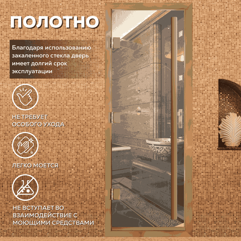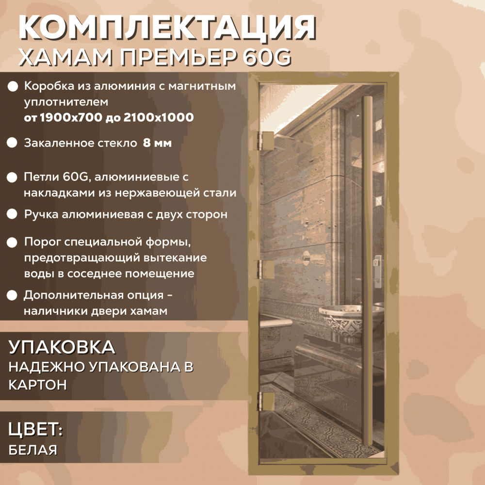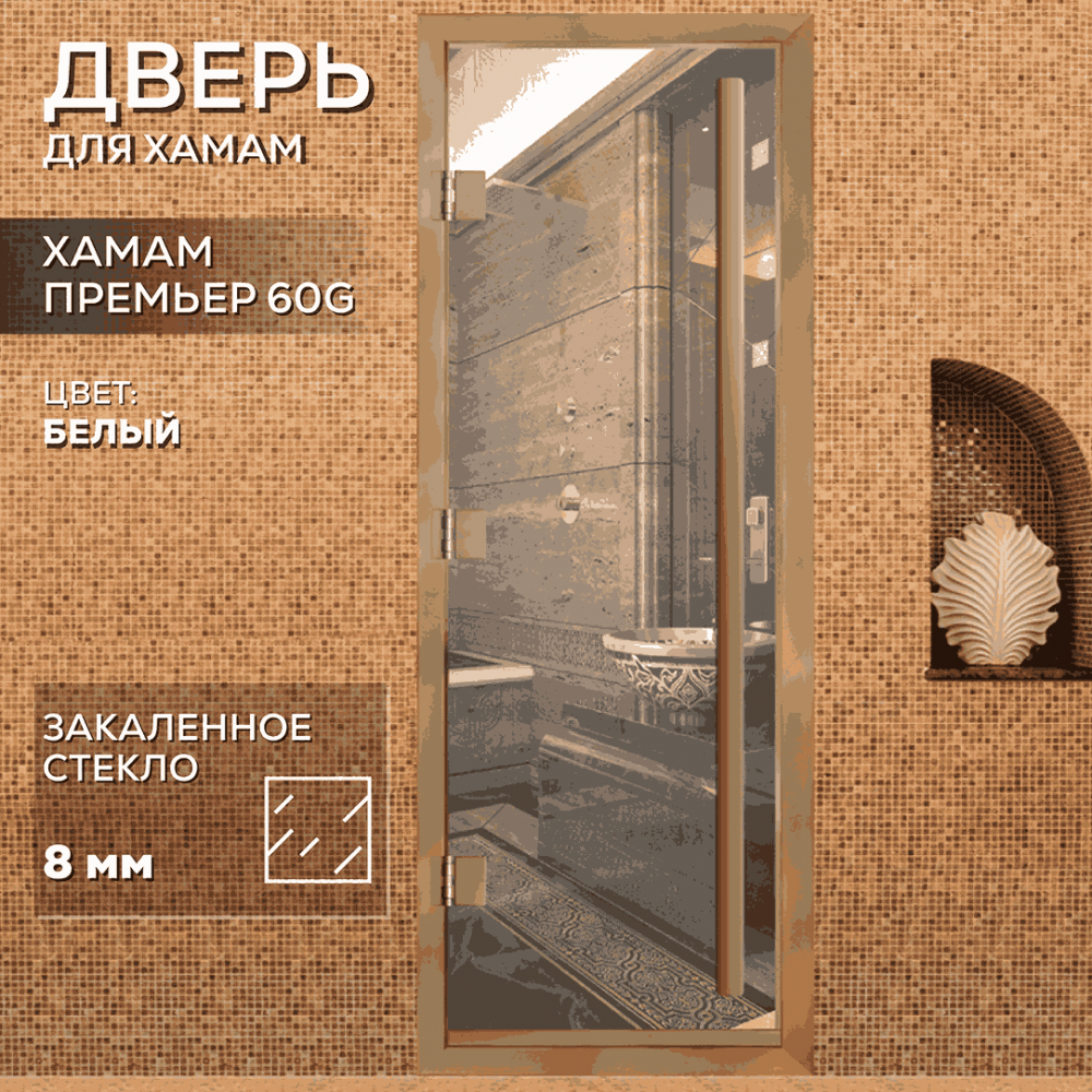 Дверь для хаммама АРТА Премьер 60G – отличное решение для помещений с повышенной влажностью (турецкой парной, душевой, бассейна), где пластик не выдерживает высокую температуру, а дерево разбухает и гниет от влаги. Все дверные полотна изготовлены из надёжного закаленного стекла 8 мм, благодаря применяемым технологиям это стекло абсолютно безопасно. Коробка выполнена из анодированного алюминиевого профиля, а специальный магнитный уплотнитель позволяет мягко и плотно закрываться двери даже если на нее попала вода.Предусмотрен порог, предохраняющий от протечки воды в соседние помещения, зазор для вентиляции в нижней части двери. В комплектации предусмотрена вертикальная ручка.