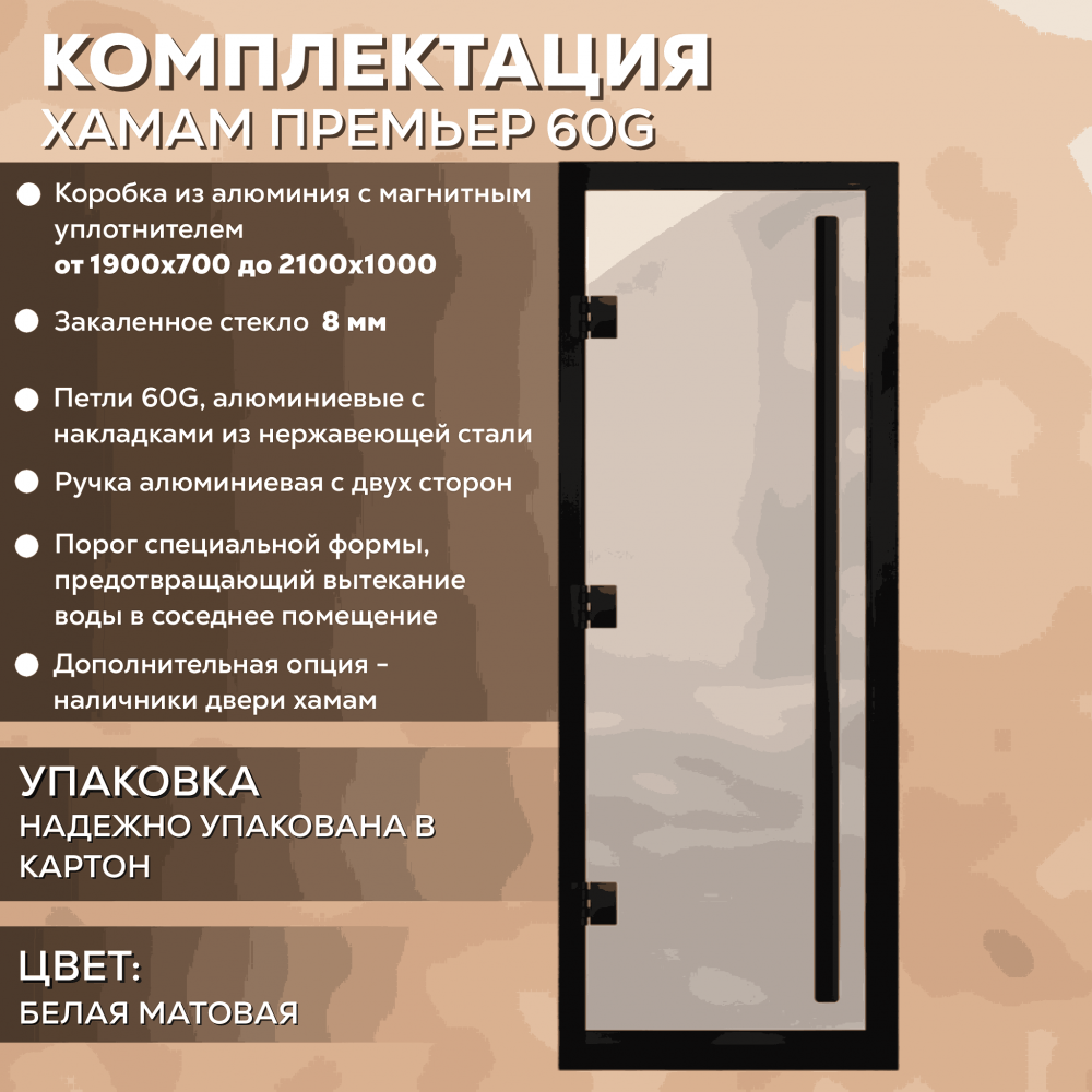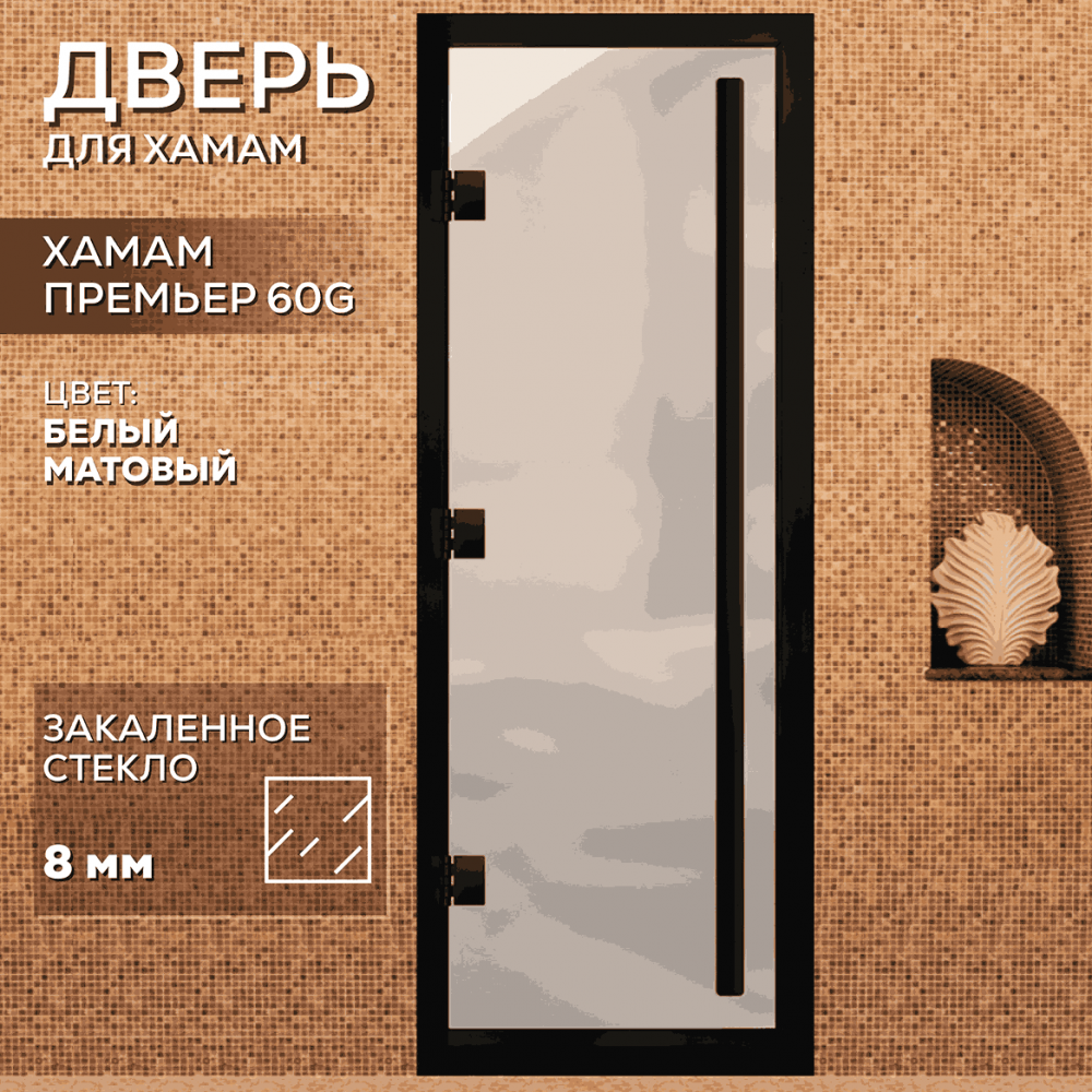 Дверь для хаммама АРТА Премьер 60G – отличное решение для помещений с повышенной влажностью (турецкой парной, душевой, бассейна), где пластик не выдерживает высокую температуру, а дерево разбухает и гниет от влаги. Все дверные полотна изготовлены из надёжного закаленного стекла 8 мм, благодаря применяемым технологиям это стекло абсолютно безопасно. Коробка выполнена из анодированного алюминиевого профиля, а специальный магнитный уплотнитель позволяет мягко и плотно закрываться двери даже если на нее попала вода.Предусмотрен порог, предохраняющий от протечки воды в соседние помещения, зазор для вентиляции в нижней части двери. В комплектации предусмотрена вертикальная ручка.