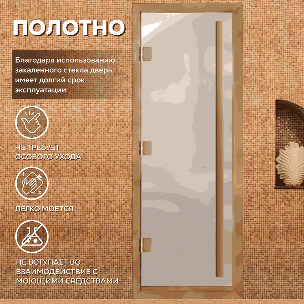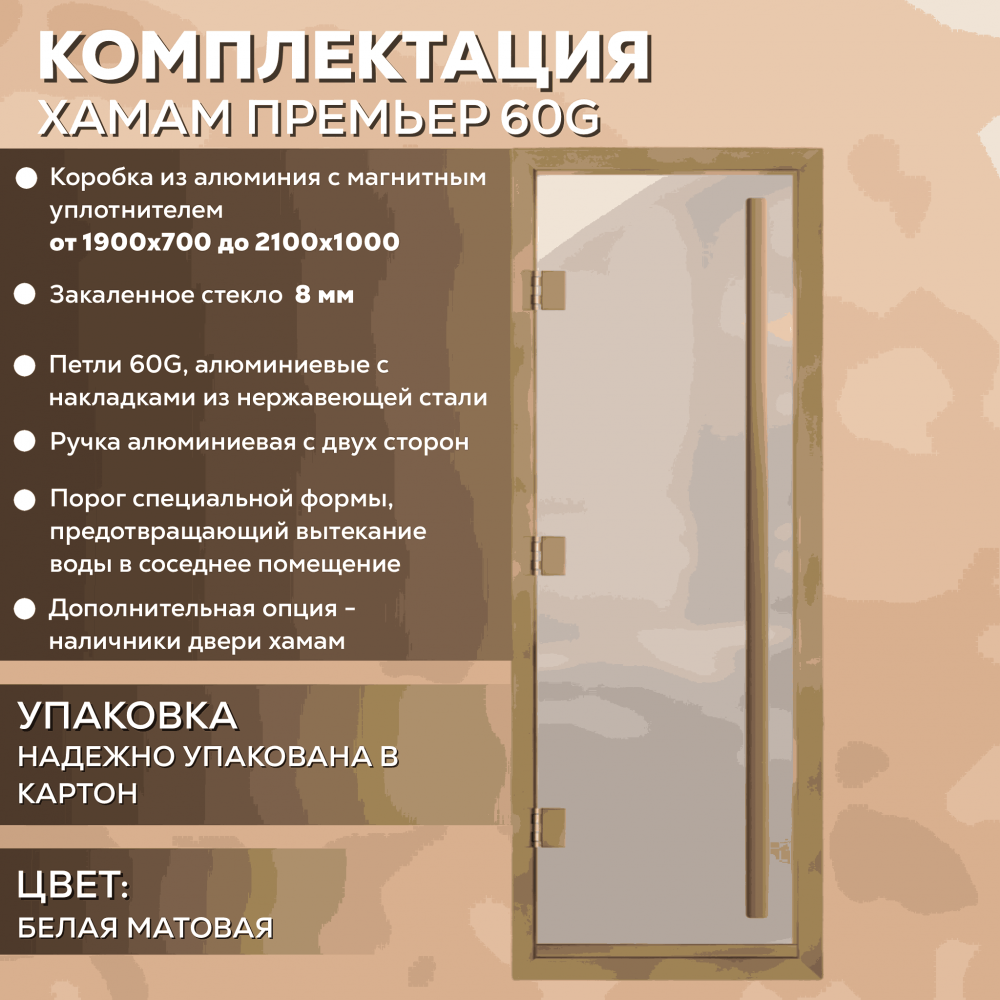 Дверь для хаммама АРТА Премьер 60G – отличное решение для помещений с повышенной влажностью (турецкой парной, душевой, бассейна), где пластик не выдерживает высокую температуру, а дерево разбухает и гниет от влаги. Все дверные полотна изготовлены из надёжного закаленного стекла 8 мм, благодаря применяемым технологиям это стекло абсолютно безопасно. Коробка выполнена из анодированного алюминиевого профиля, а специальный магнитный уплотнитель позволяет мягко и плотно закрываться двери даже если на нее попала вода.Предусмотрен порог, предохраняющий от протечки воды в соседние помещения, зазор для вентиляции в нижней части двери. В комплектации предусмотрена вертикальная ручка.