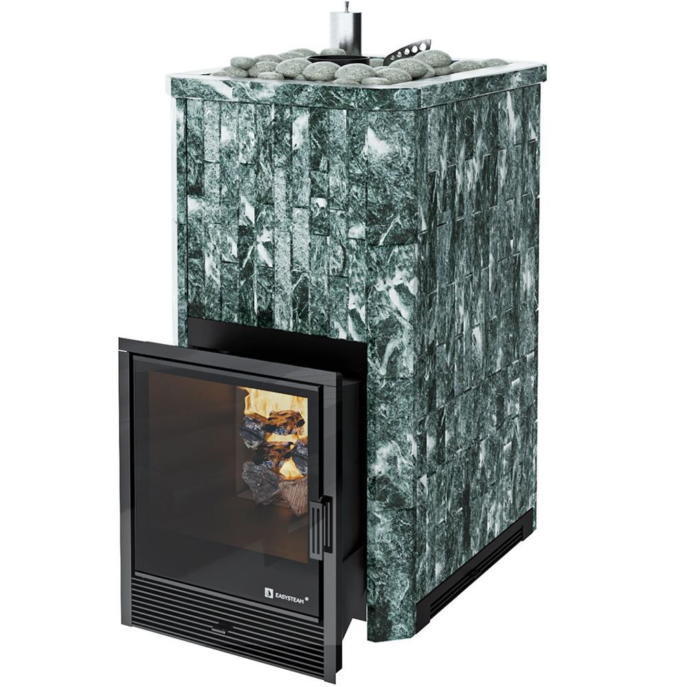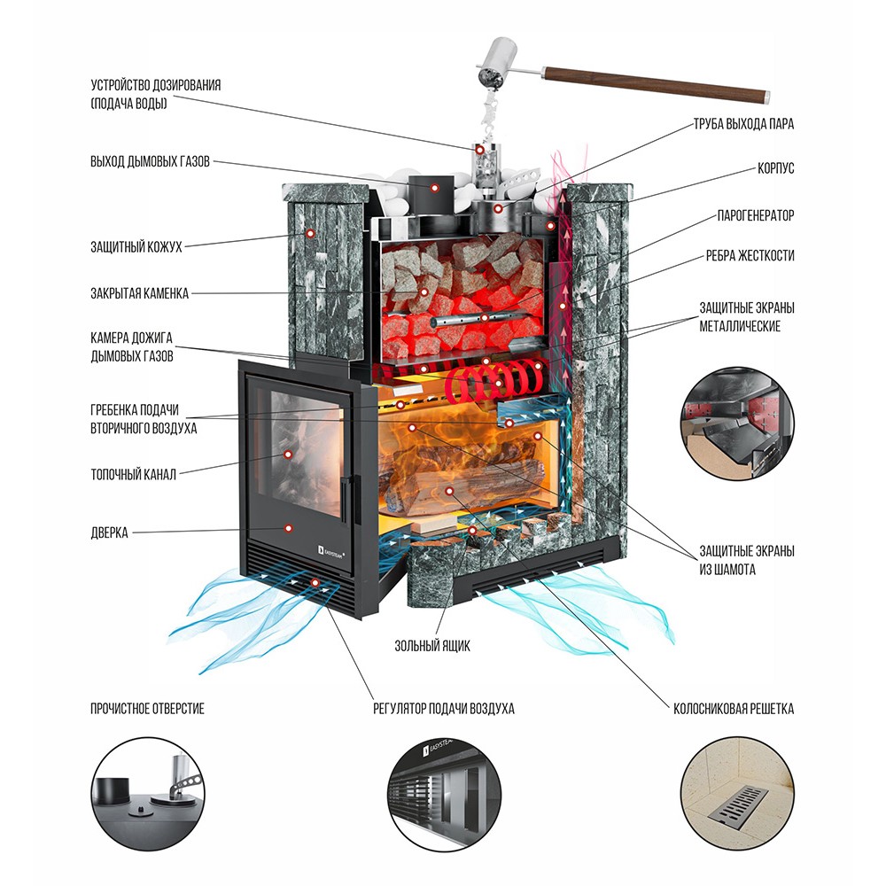 Закрытая каменка позволяет разогреть камни до высоких температур 500-600 градусов, а встроенный парогенератор обеспечивает попадание пароводяной смеси на нижний самый разогретый слой камней, и на выходе получить качественный мелкодисперсный лёгкий пар.