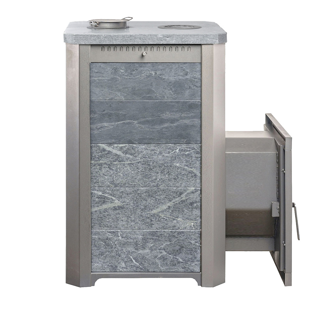 Печь "Сказка" для парных с объемом до 24 куб. метров – банная печь с закрытой каменкой, облицованная в кожух из камня талькохлорит с выносным топочным тоннелем длиной 266 мм (топится из смежного с парной помещения) комплектуется панорамным стеклом в дверце.