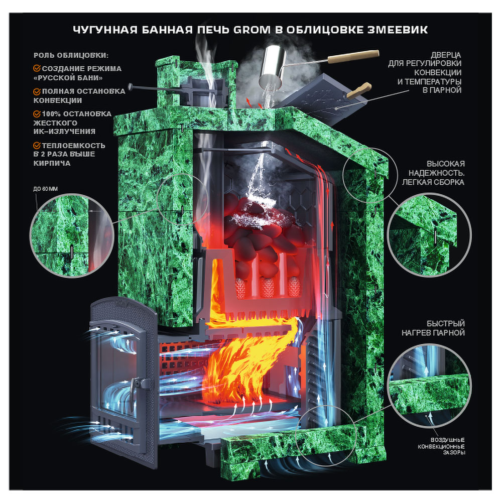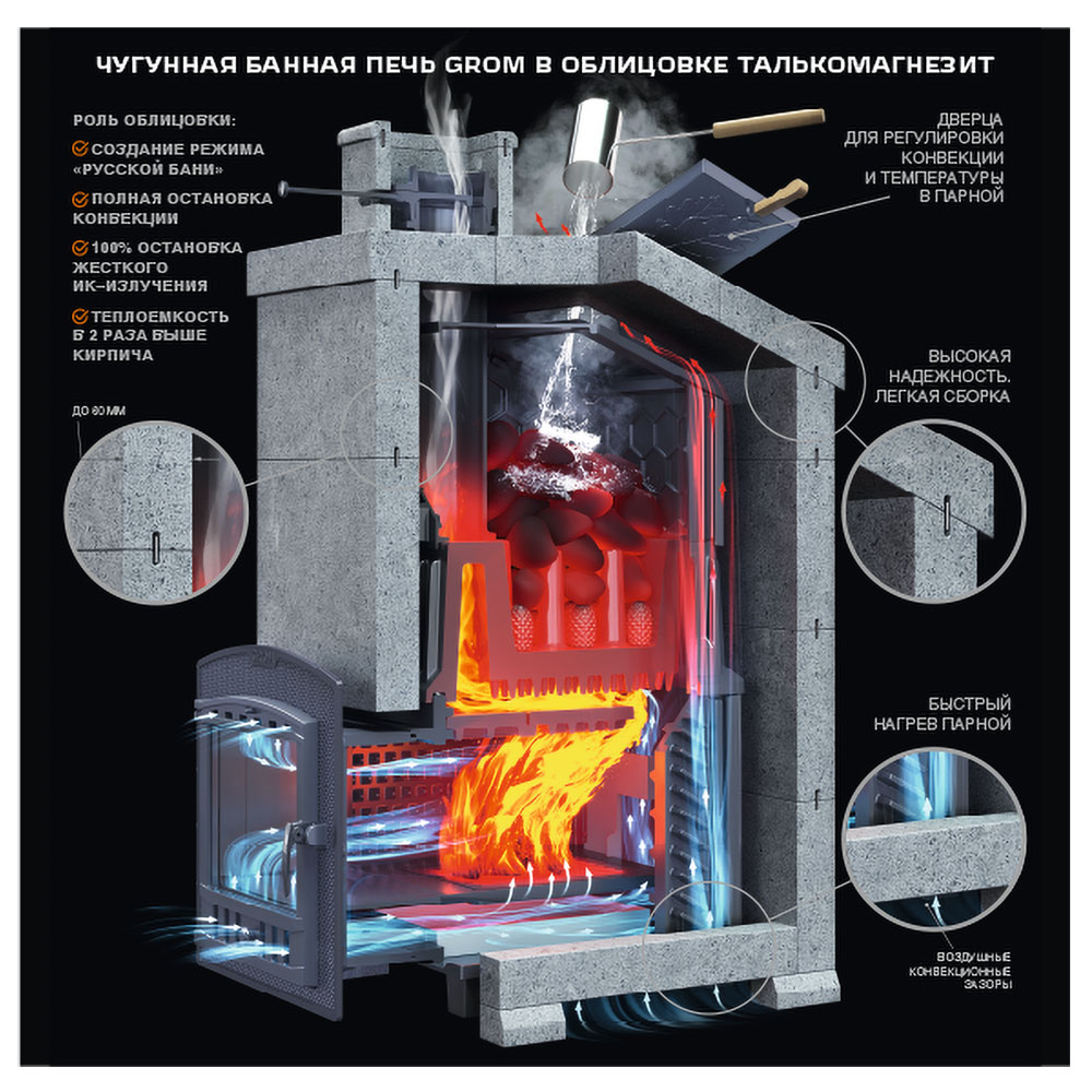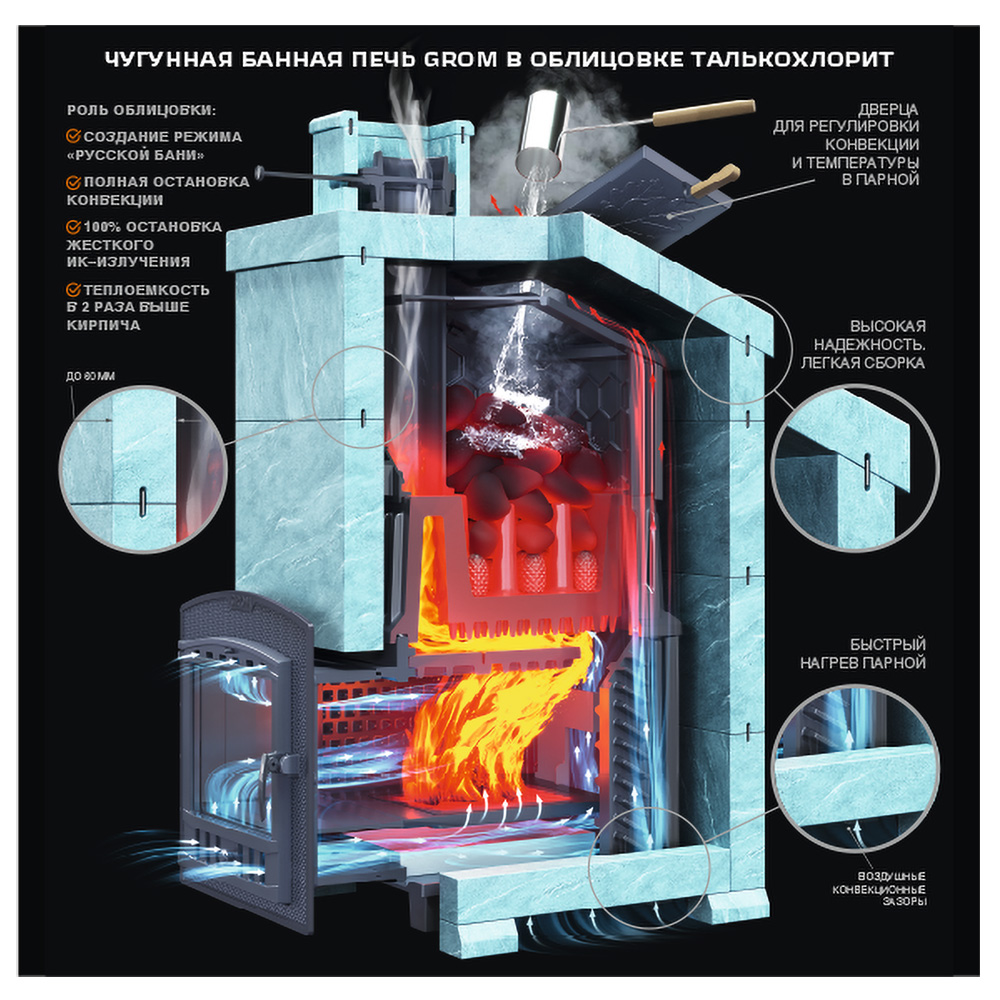 Боковые стенки оборудованы конвекционными ребрами не только снаружи, но и на внутренней поверхности. Они увеличивают площадь теплопередающей поверхности на 110 процентов, что обеспечивает быстрый нагрев парной.