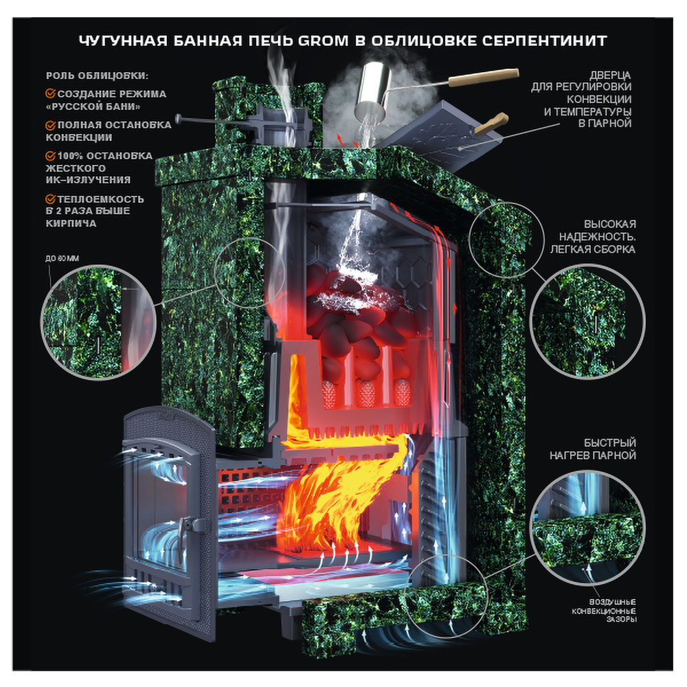 Печь Гром с уникальной каменкой прямого нагрева для получения легкого мелкодисперсного пара, необходимого для режима русской бани. Благодаря инновационной конструкции, печь гарантированно входит в режим за 40 минут. Каменка этих печей является незаливаемой.
