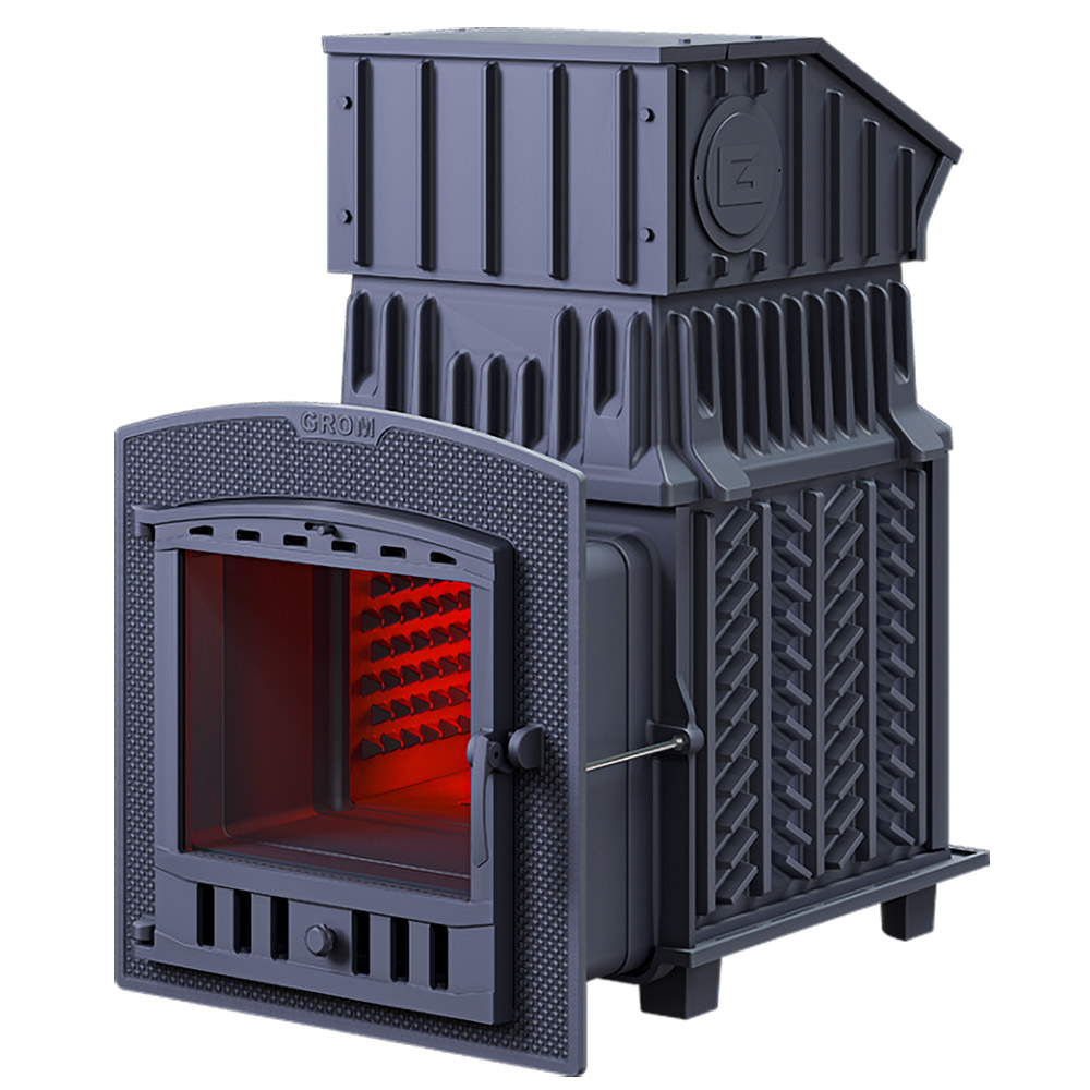 Печь для бани Гром - модель повышенной мощности и надежности для коммерческого применения. Основной принцип работы печи – получение пара с теплоёмкой каменки прямого нагрева. Каменка является сводом топки, нагревается с нижней поверхности снабженной теплосъемными шипами для увеличения контакта с пламенем. Увеличенная масса, толщина боковых стенок 14 мм повышают надежность и теплоаккумулирующую способность, а для быстрого нагрева парной боковые стенки оборудованы конвекционными ребрами не только снаружи, но и на внутренней поверхности.