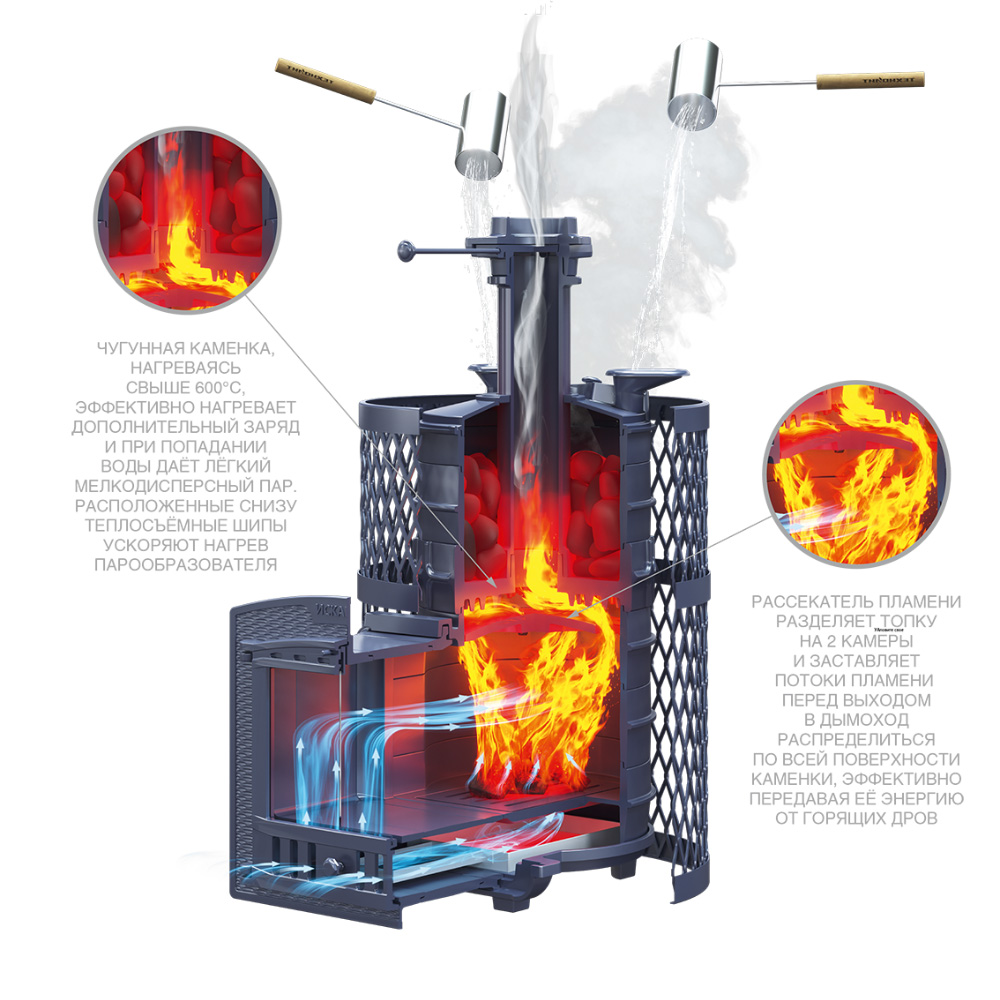 Рассекатель пламени разделяет топку на 2 камеры и заставляет потоки пламени перед выходом в дымоход распределиться по всей поверхности каменки эффективно передавая её энергию от горящих дров.
