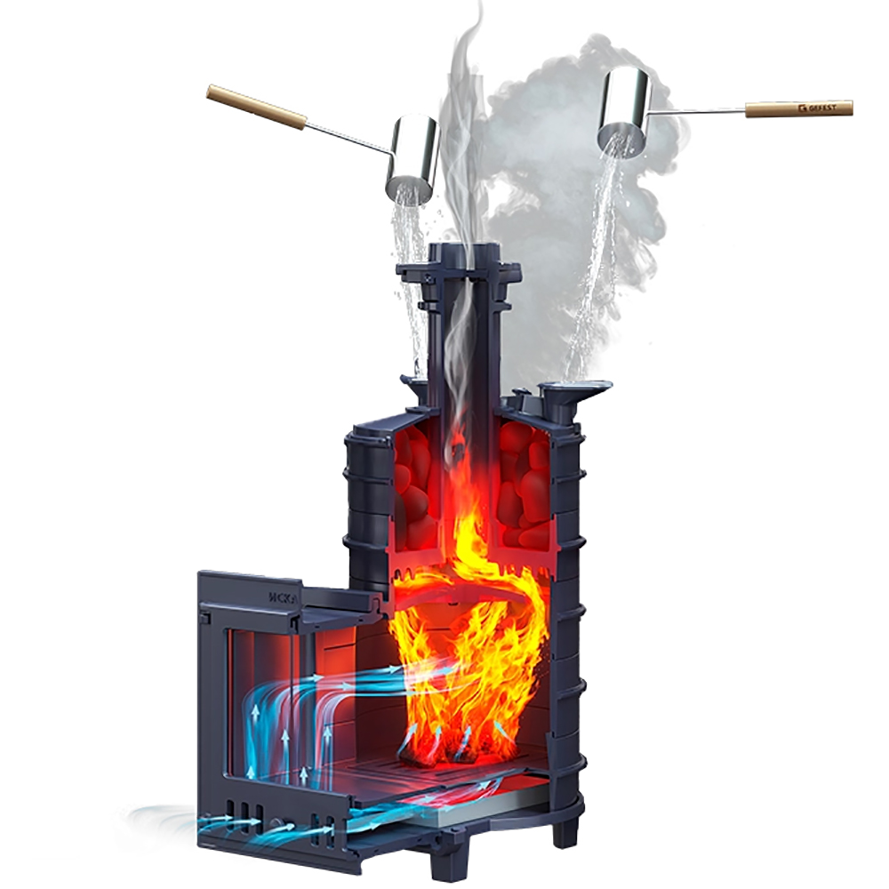 Печь эконом-класса быстро нагревает воздух в парной и производит качественный мелкодисперсный пар за счёт теплоёмкой каменки, оснащённой теплосъёмными шипами на нижней поверхности.