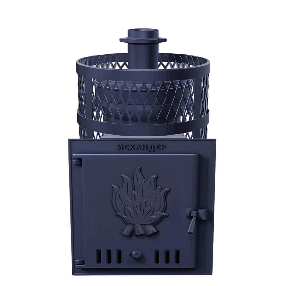 Чугунная банная печь Искандер 18 с чугунной глухой дверцей и с сеткой для камней для парных объемом до 18 м. куб.