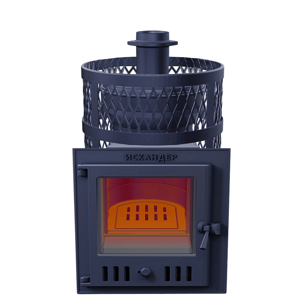 Чугунная банная печь Искандер 25 с чугунной дверцей со стеклом и с сеткой для камней для парных объемом до 25 м. куб.