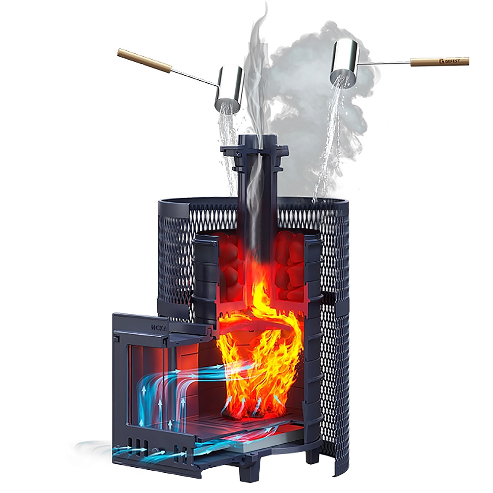 Печь эконом-класса быстро нагревает воздух в парной и производит качественный мелкодисперсный пар за счёт теплоёмкой каменки, оснащённой теплосъёмными шипами на нижней поверхности.