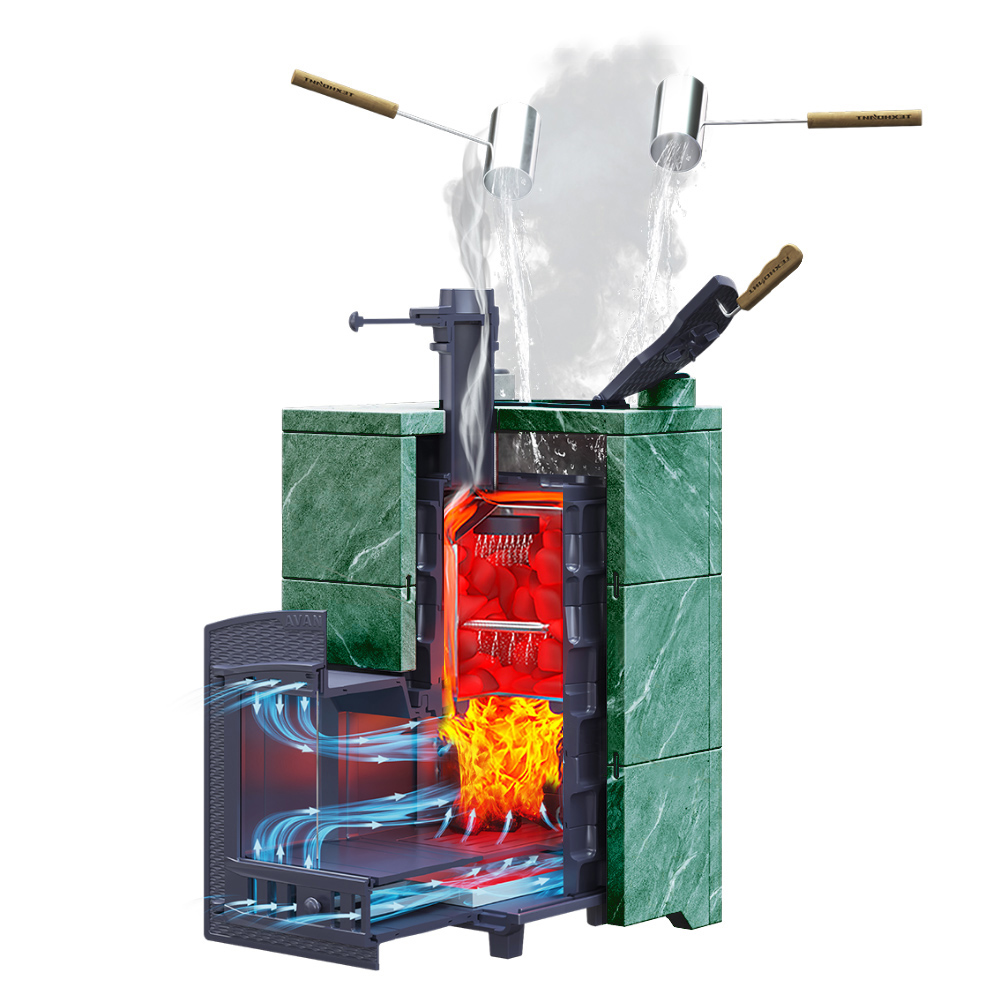 наполняет парную лучевым теплом от тёплого натурального камня, закрывая жесткий тепловой нагрев от чугунной топки;