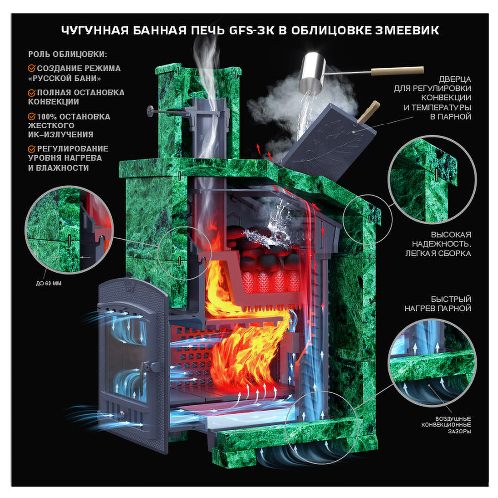 Чугунные банные печи ГЕФЕСТ изготовлены из легированного чугуна с толщиной деталей до 50 мм. Отличие модели «ГЕФЕСТ ЗК» от других серий ГЕФЕСТ — в усиленной каменке большой массы, с единым углублением внутрь топки для дополнительной укладки чугунного заряда. Теплосъемные шипы со стороны горения пламени в разы увеличивают площадь соприкосновения огня с каменкой и ускоряют передачу тепла, а также способствуют лучшему дожигу. Эти усовершенствования значительно повышают мощность парообразования печи «ГЕФЕСТ-ЗК» и выдают большее количество пара при непрерывной поддаче воды. Толщина стенок от 10 до 50 мм делает печь Гефест самой надежной среди чугунных печей, а получаемая масса печи аккумулирует большое количество тепла, позволяет даже при потухшем пламени еще длительное время наслаждаться банными процедурами и существенно снижает расход дров по сравнению с железными печами. Заряд в такой каменке нагревается свыше 500 ⁰С — только с такой температурой получается легкий мелкодисперсный пар, что крайне важно для создания в парной режима «Русская баня». Конвекционные ребра на боковых стенках увеличивают теплопередачу от горящих дров к воздуху в парном помещении. За счет этого печь, несмотря на значительную толщину и массу, быстро выводит парную в требуемый режим.