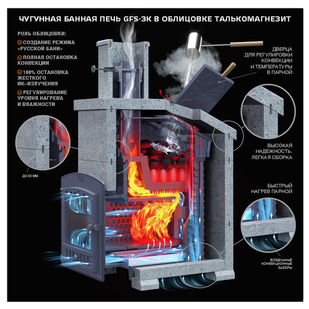 Чугунные банные печи ГЕФЕСТ изготовлены из легированного чугуна с толщиной деталей до 50 мм. Отличие модели «ГЕФЕСТ ЗК» от других серий ГЕФЕСТ — в усиленной каменке большой массы, с единым углублением внутрь топки для дополнительной укладки чугунного заряда. Теплосъемные шипы со стороны горения пламени в разы увеличивают площадь соприкосновения огня с каменкой и ускоряют передачу тепла, а также способствуют лучшему дожигу. Эти усовершенствования значительно повышают мощность парообразования печи «ГЕФЕСТ-ЗК» и выдают большее количество пара при непрерывной поддаче воды. Толщина стенок от 10 до 50 мм делает печь Гефест самой надежной среди чугунных печей, а получаемая масса печи аккумулирует большое количество тепла, позволяет даже при потухшем пламени еще длительное время наслаждаться банными процедурами и существенно снижает расход дров по сравнению с железными печами. Заряд в такой каменке нагревается свыше 500 ⁰С — только с такой температурой получается легкий мелкодисперсный пар, что крайне важно для создания в парной режима «Русская баня». Конвекционные ребра на боковых стенках увеличивают теплопередачу от горящих дров к воздуху в парном помещении. За счет этого печь, несмотря на значительную толщину и массу, быстро выводит парную в требуемый режим.