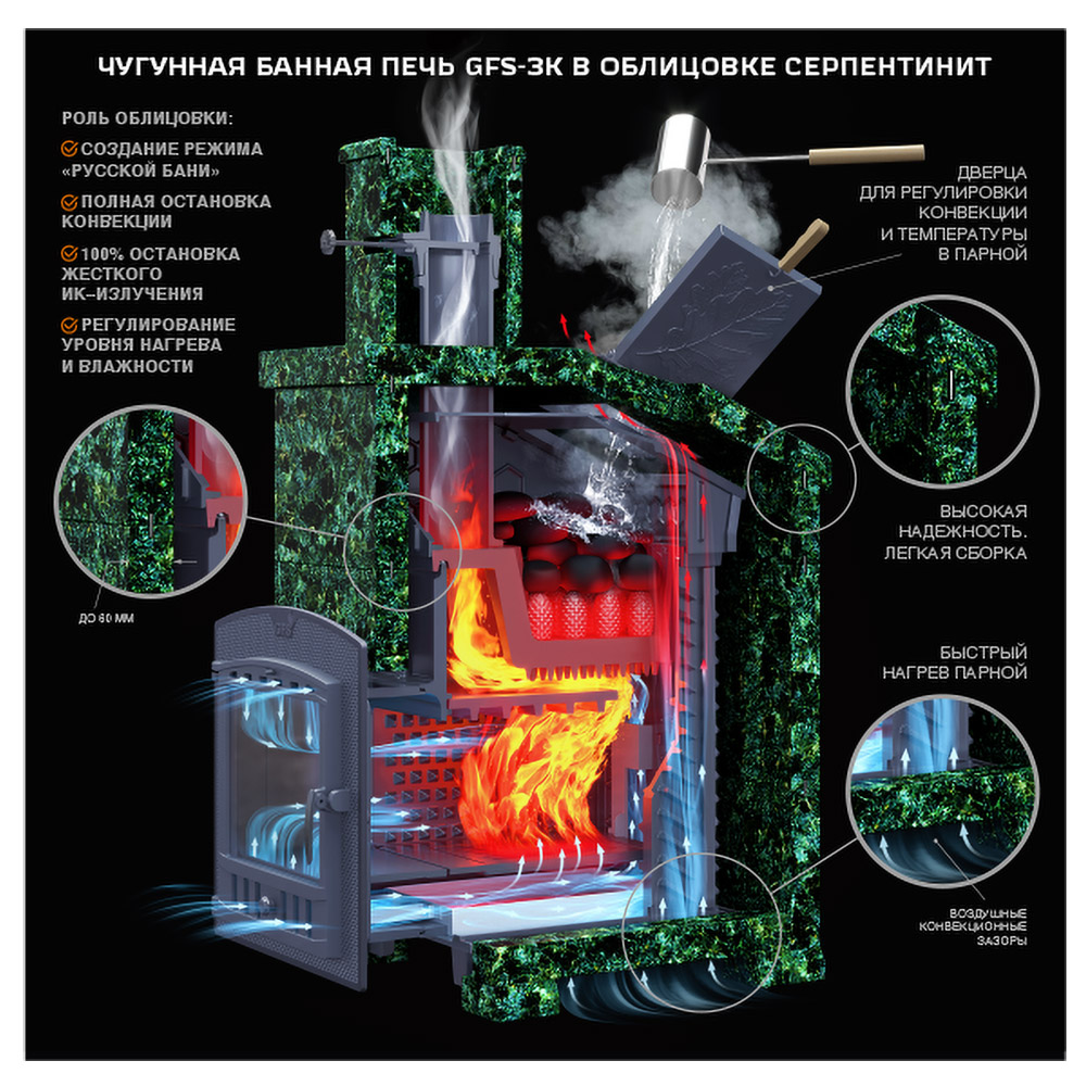Чугунные банные печи ГЕФЕСТ изготовлены из легированного чугуна с толщиной деталей до 50 мм. Отличие модели «ГЕФЕСТ ЗК» от других серий ГЕФЕСТ — в усиленной каменке большой массы, с единым углублением внутрь топки для дополнительной укладки чугунного заряда. Теплосъемные шипы со стороны горения пламени в разы увеличивают площадь соприкосновения огня с каменкой и ускоряют передачу тепла, а также способствуют лучшему дожигу. Эти усовершенствования значительно повышают мощность парообразования печи «ГЕФЕСТ-ЗК» и выдают большее количество пара при непрерывной поддаче воды. Толщина стенок от 10 до 50 мм делает печь Гефест самой надежной среди чугунных печей, а получаемая масса печи аккумулирует большое количество тепла, позволяет даже при потухшем пламени еще длительное время наслаждаться банными процедурами и существенно снижает расход дров по сравнению с железными печами. Заряд в такой каменке нагревается свыше 500 ⁰С — только с такой температурой получается легкий мелкодисперсный пар, что крайне важно для создания в парной режима «Русская баня». Конвекционные ребра на боковых стенках увеличивают теплопередачу от горящих дров к воздуху в парном помещении. За счет этого печь, несмотря на значительную толщину и массу, быстро выводит парную в требуемый режим.