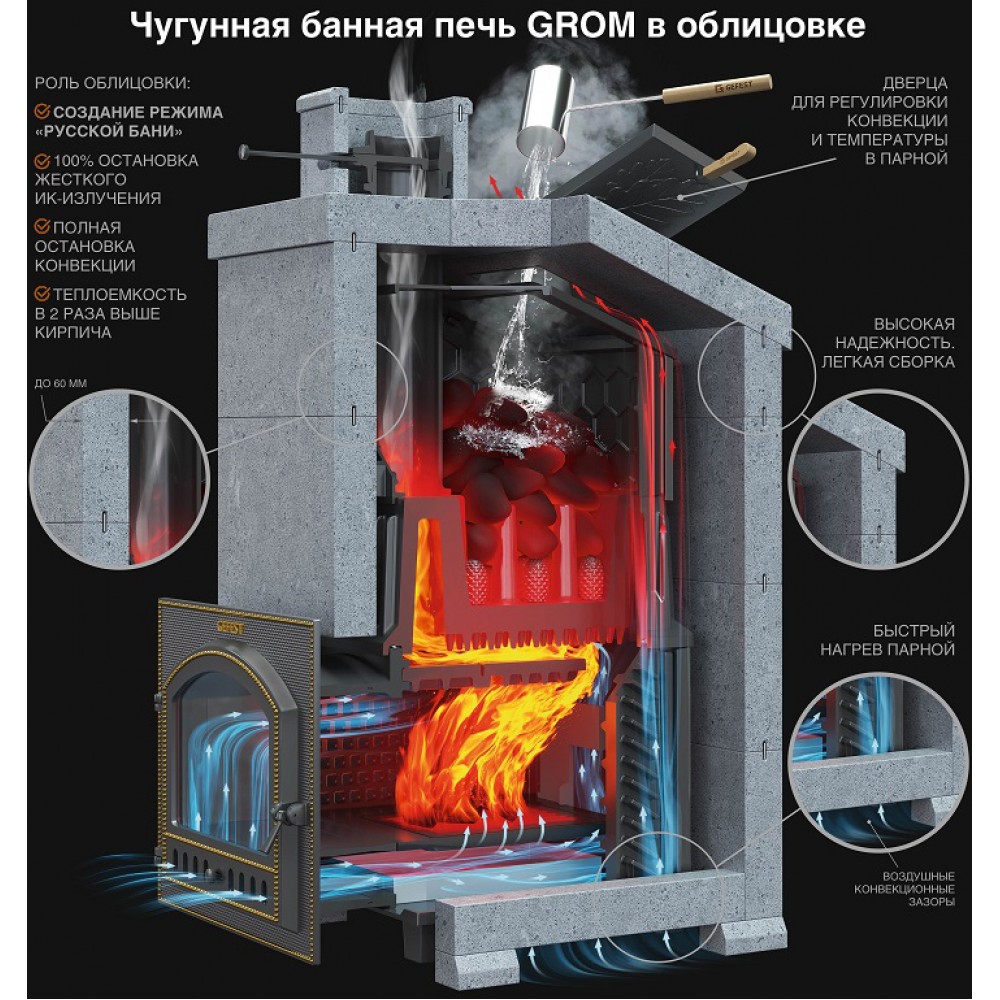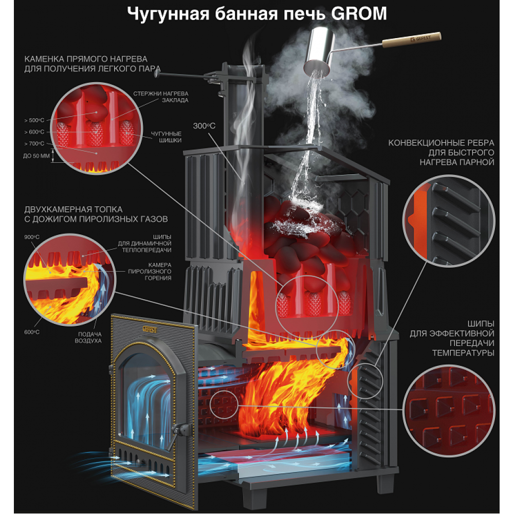 Чугунные банные печи ГЕФЕСТ изготовлены из легированного чугуна с толщиной деталей до 50 мм. Печи линейки «Гром» имеют в комплекте чугунный короб для установки на каменку и чугунную стартовую трубу длиной 500 мм. Увеличенная масса, толщина боковых стенок 14 мм повышают надежность и теплоаккумулирующую способность, а для быстрого нагрева парной боковые стенки оборудованы конвекционными ребрами не только снаружи, но и на внутренней поверхности.