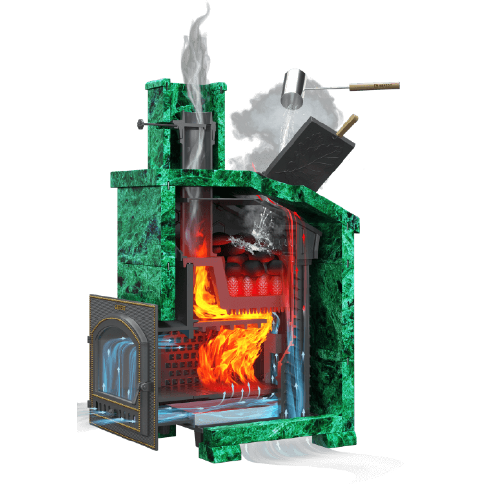 Талькохлорит - камень, известный людям многие тысячелетия. В народе талькохлорит также называют "мыльным камнем". Благодаря лёгкости обработки, долговечности, является прекрасным строительным и облицовочным огнеупорным материалом, обладает высокой теплоемкостью и теплопроводностью. Он выдерживает температуру до 1600 °C, а за счёт высокой теплоёмкости максимально аккумулирует тепловую энергию и долго и равномерно её отдаёт. Талькохлорит обладает мягким, приятным тепловым излучением,близким по своей природе к солнечному. Он разогревается в 10 раз быстрее, сохраняет в 2,5 раза больше тепла и отдаёт его в два раза дольше,чем печной кирпич. Доброе тепло талькохлорита повышает иммунитет организма к различным инфекционным заболеваниям, таким, например, как грипп, снижает кровяное давление, благотворно влияет на органы дыхания, улучшает обмен веществ и стабилизирует кровообращение.