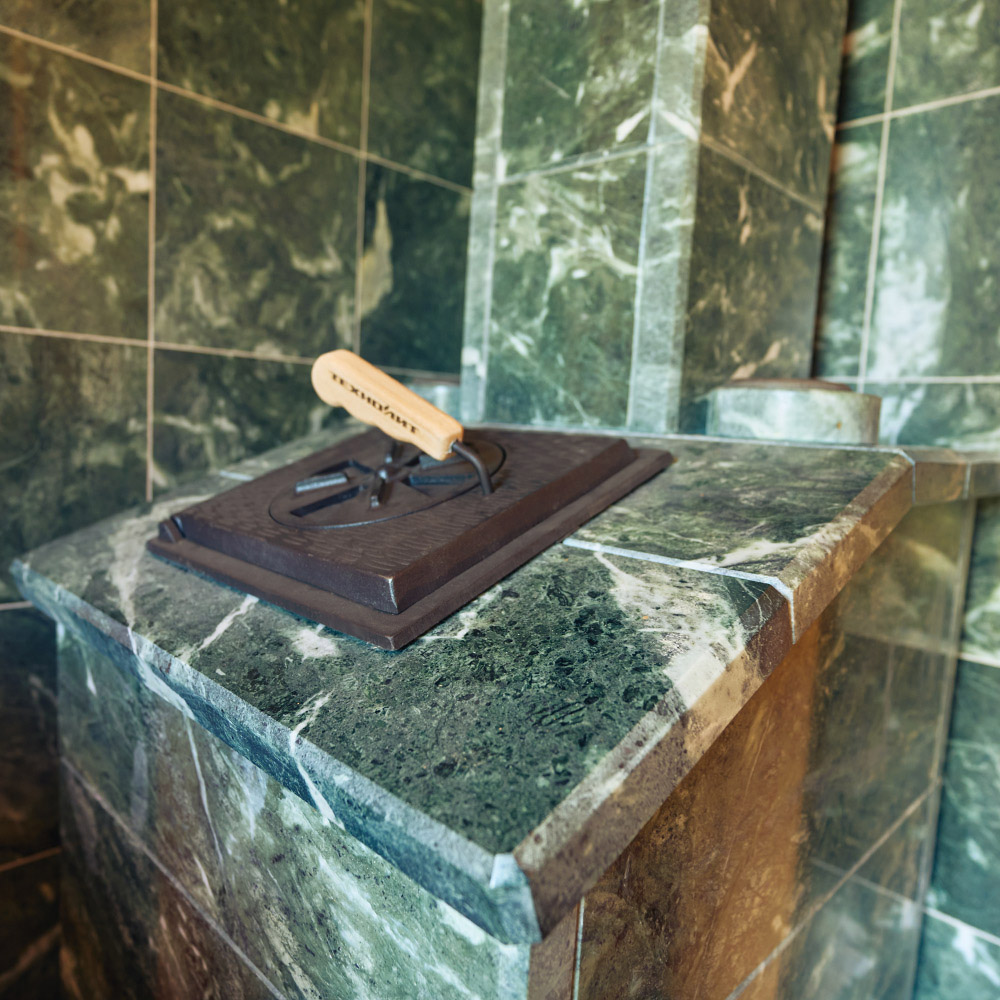 наполняет парную лучевым теплом от тёплого натурального камня, закрывая жесткий тепловой нагрев от чугунной топки;
