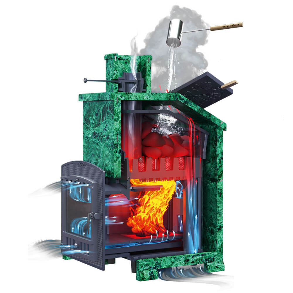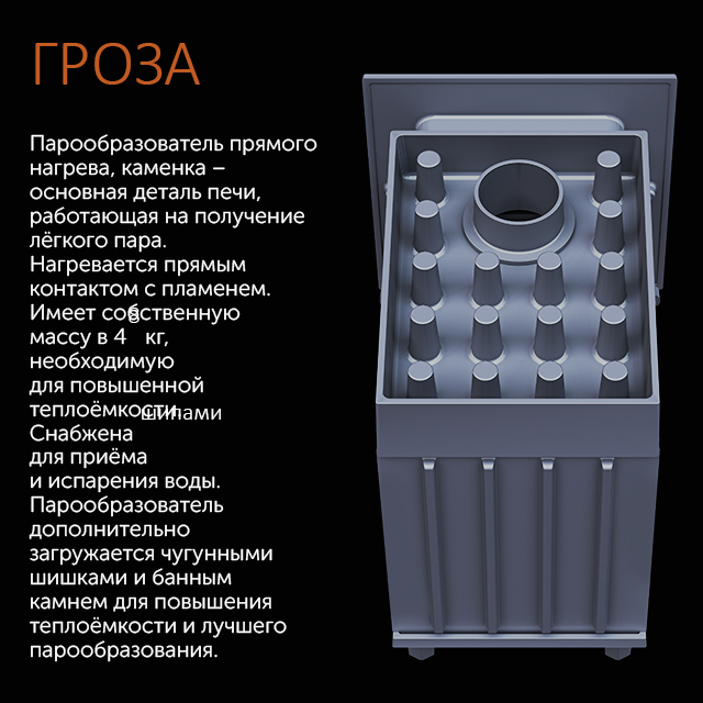 Печь рассчитана для создания паровых режимов «русская баня». Печь Гроза с уникальной каменкой прямого нагрева спроектирована и рекомендуется для получения легкого мелкодисперсного пара, необходимого для режима русской бани.