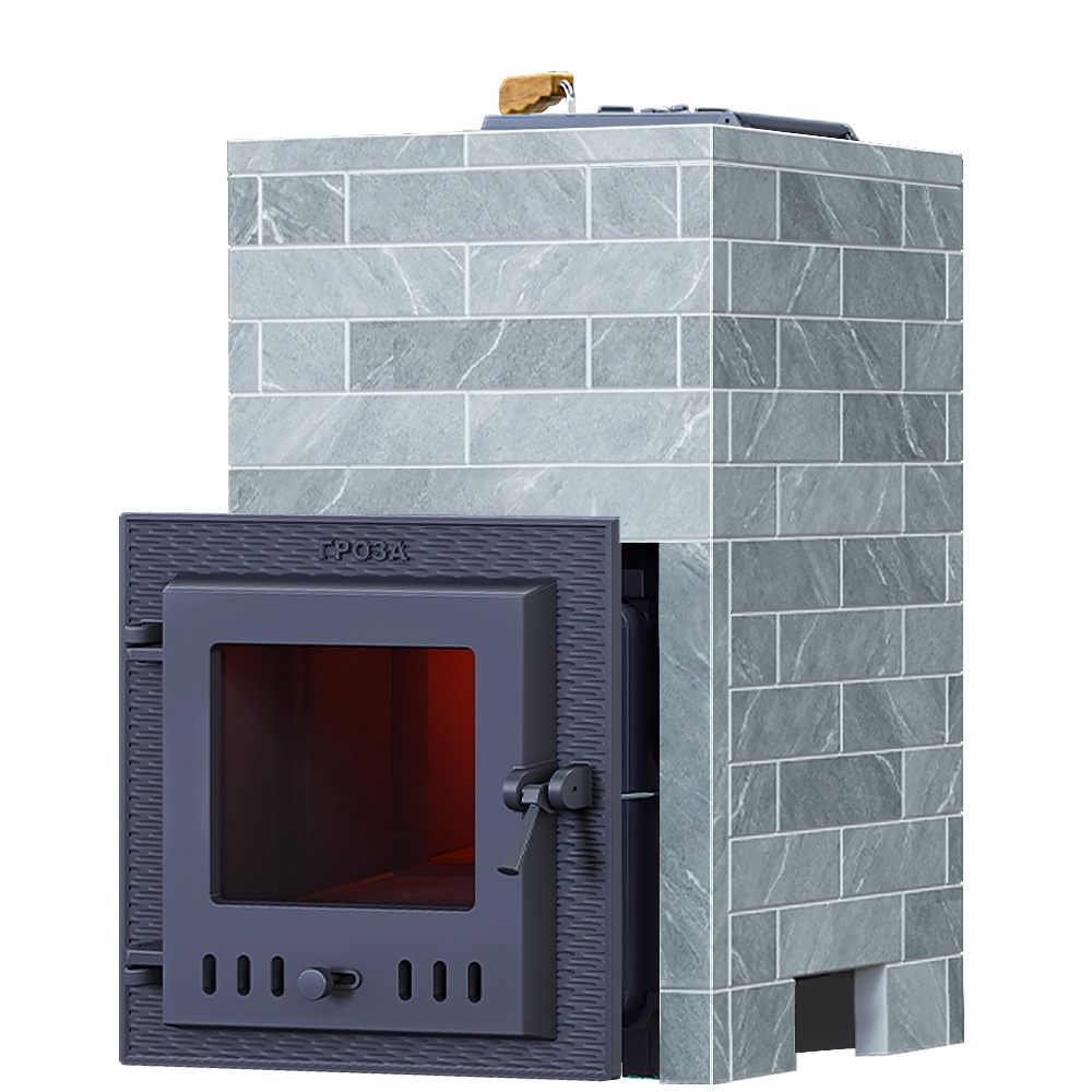 Печь Гроза 24 облицовке Классика 930/40 из натурального камня талькохлорит и стеклом в дверце для парных объемом до 24 м. куб. Чугунная банная печь «Гроза» предназначена для отопления парного помещения и генерации мелкодисперсного пара. Вокруг печи - каменная обкладка, которая послужит защитным ограждением и увеличит теплоёмкость банной печи. В комплекте чугунный короб для установки на каменку. Внутренняя каменка вместимостью до 40 кг.