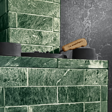 Облицовка из плит змеевика - это простой и эффективный способ создать режим русской бани. Облицовка представляет собой плитки зелёного камня с краями, обработанными фаской. Эта облицовка также, как и облицовка из классического кирпича, останавливает жёсткое инфракрасное излучение и конвекцию, легко собирается/разбирается и не требует никаких специальных навыков при сборке. Облицовка для печи формы «Классика » обеспечивает весь необходимый функционал: