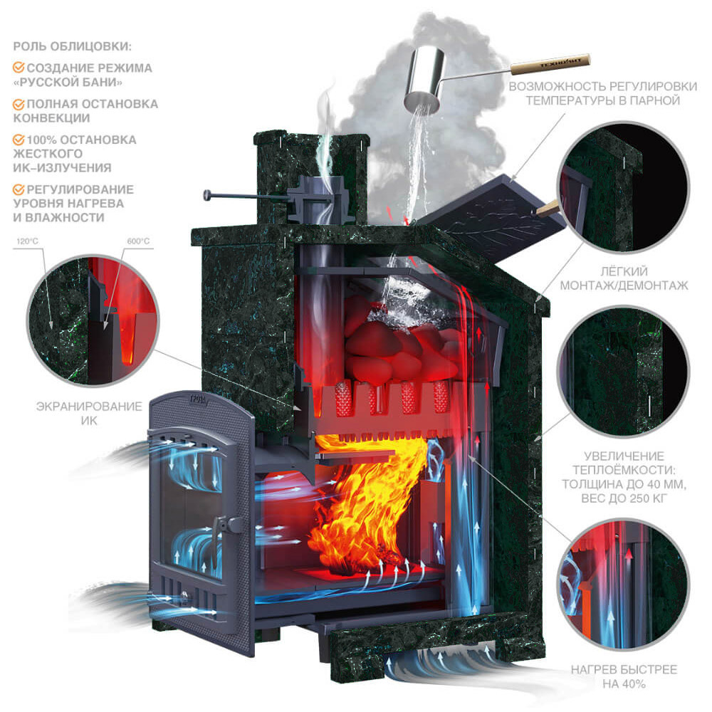 Печь быстро нагревает воздух в парной и производит качественный мелкодисперсный пар, необходимый для режима русской бани за счёт теплоёмкой каменки, оснащённой теплосъёмными шипами на нижней поверхности которые ускоряют нагрев камней. Благодаря инновационной конструкции, печь гарантированно входит в режим за 45 минут.