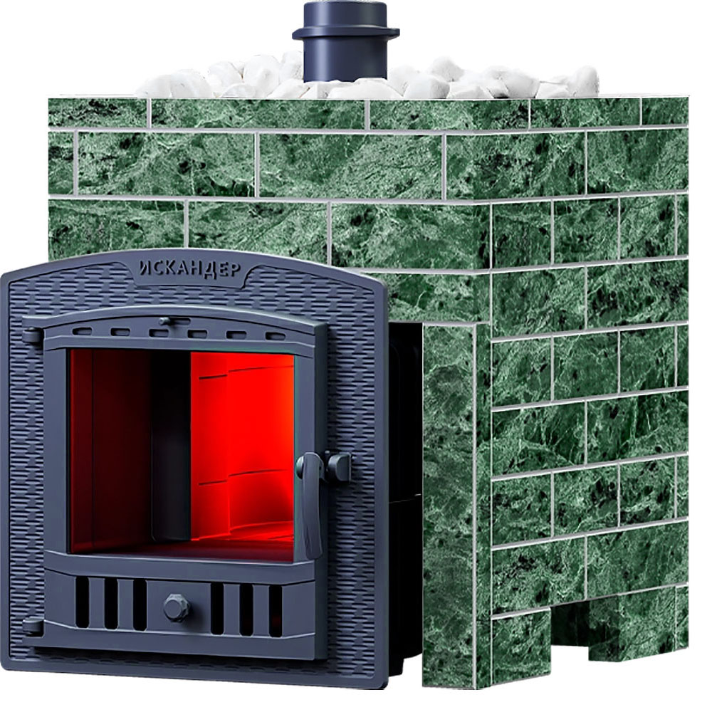 Печь Искандер 25 облицовке Оптима 680/40 из натурального камня змеевик и панорамным стеклом в дверце для парных объемом до 25 м. куб. Чугунная банная печь «Искандер» предназначена для отопления парного помещения и генерации мелкодисперсного пара. Вокруг печи - каменная обкладка, которая послужит защитным ограждением, а также дополнительной каменкой вместимостью до 20 кг. Вес камней в внутренней каменке: 30 кг.