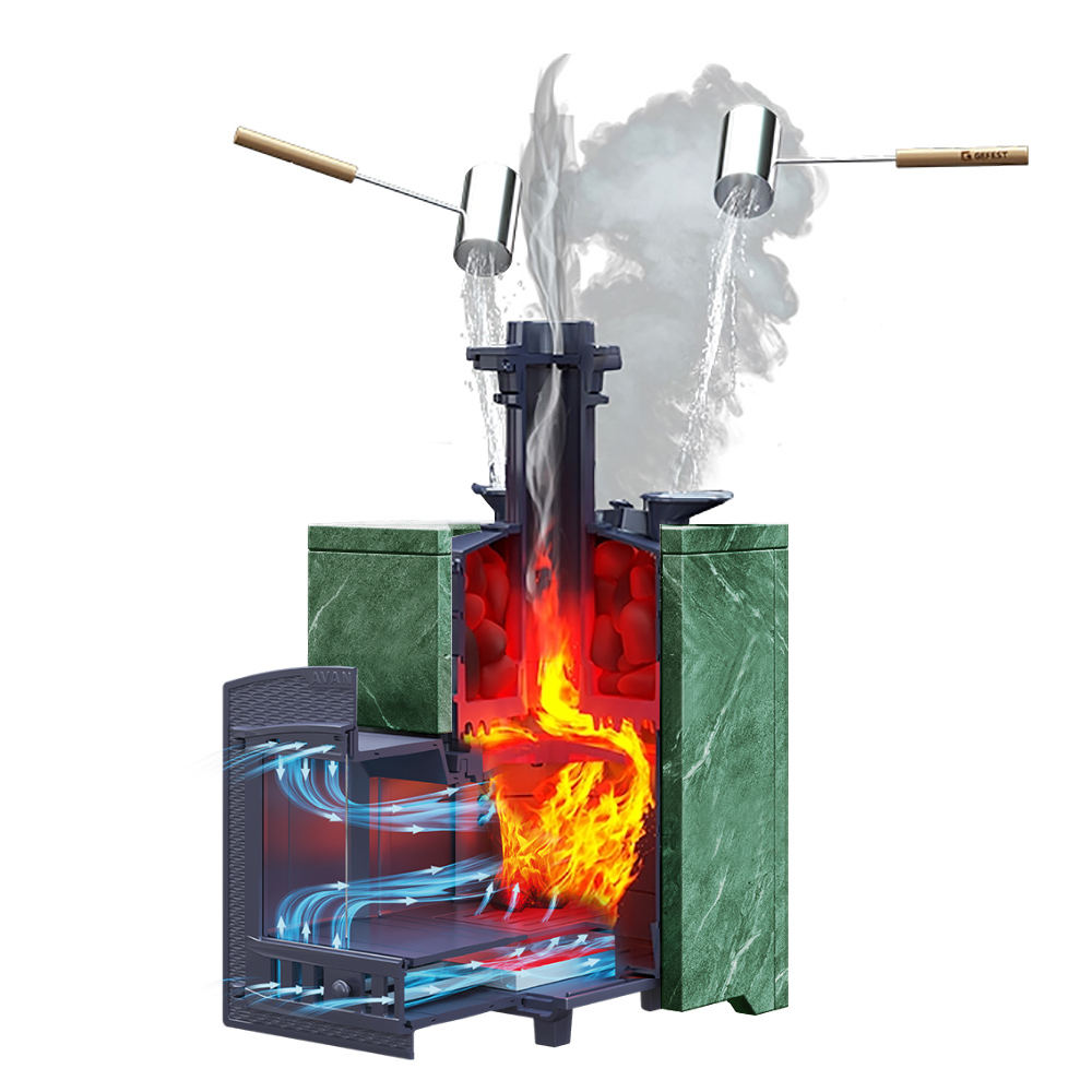 • наполняет парную лучевым теплом от тёплого натурального камня, закрывая жесткий тепловой нагрев от чугунной топки;