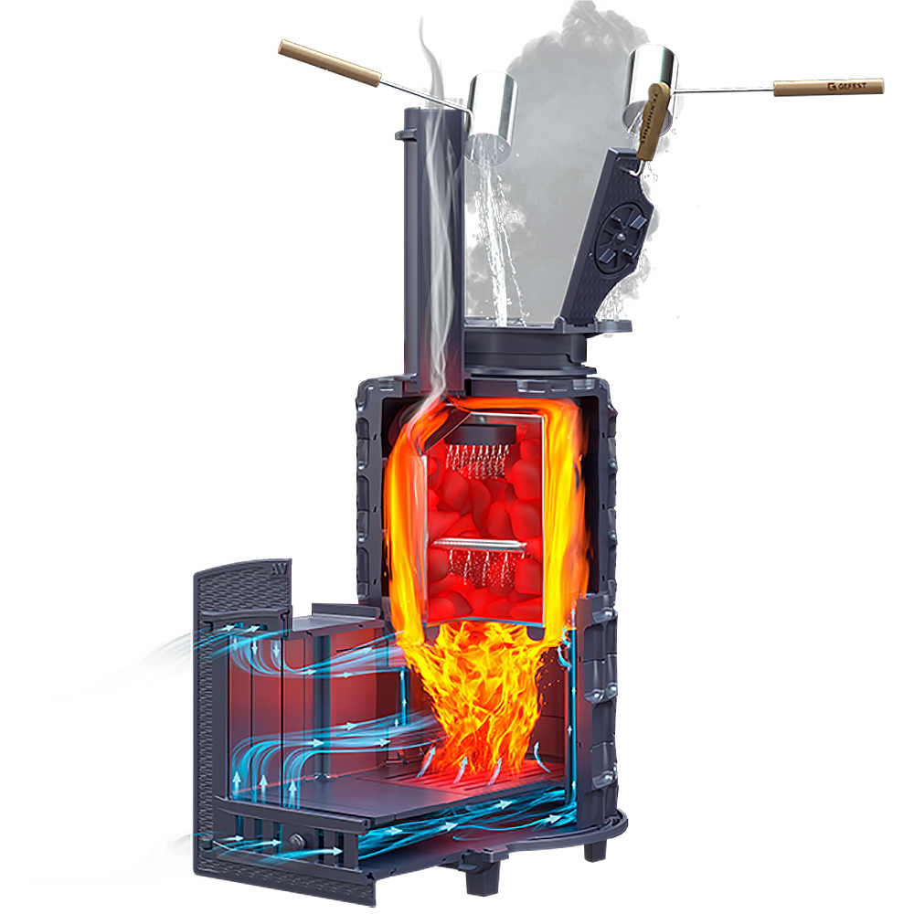 Два канала подачи воздуха для дожиза пирозизных газов. С помощью потока воздуха происходит дожиг пиролизных газов, благодаря чему повышается температура горения, что увеличивает КПД печи до 90%. Система дожига повышает температуру горения с 500 до 900°С, позволяя быстро нагреть каменку, снижает выбросы СО, дымоход не требует чистки (полное сгорание топлива).