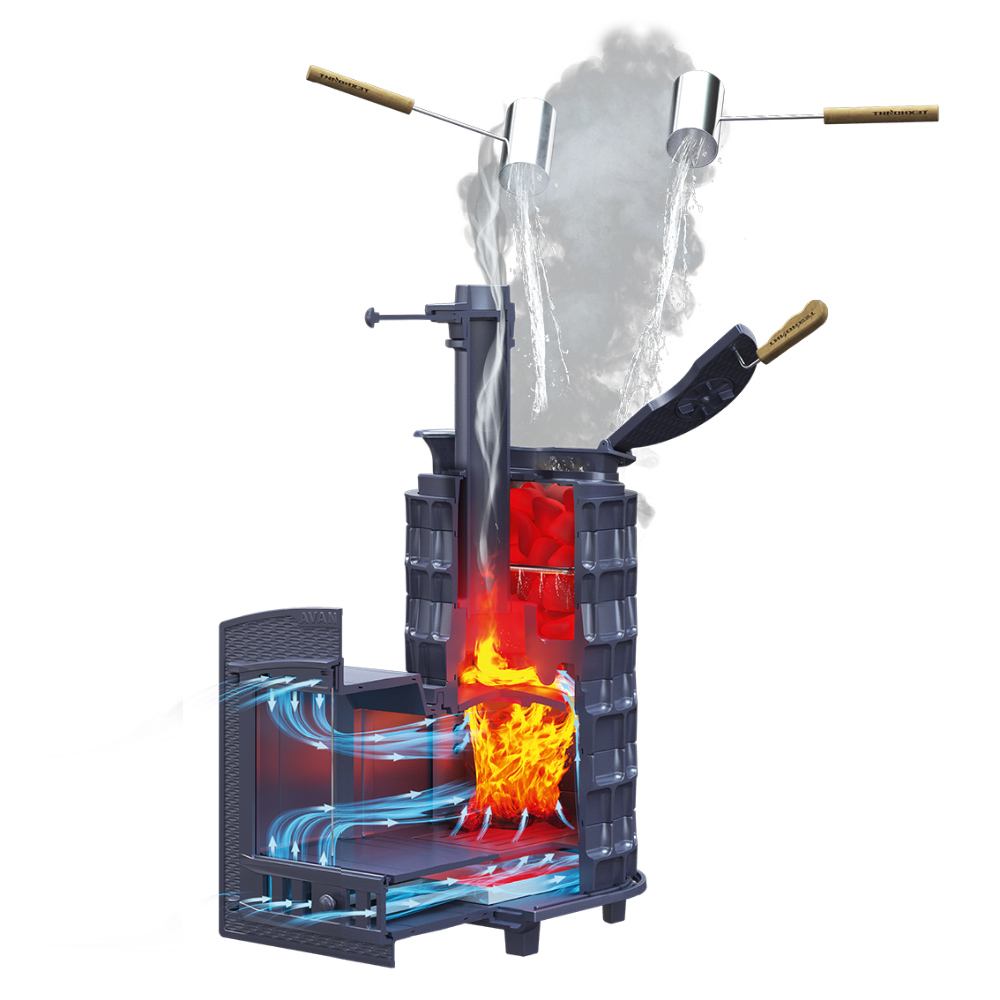 Полностью чугунная закрытая каменка печи Авангард - является основным парообразователем. Она раскаляется до 900 градусов и при попадании на неё воды способна бесконечно давать большой объем мелкодисперсного легкого пара. За счет толщины стенок в 60 мм обладает повышенной теплоёмкостью и непревзойденной надежностью. Закрытая каменка печи Авангард снабжена 2 воронками с подачей воды на разные уровни, а также клапаном выхода пара на дверке. Теперь не нужно открывать дверцу чтобы получить новую порцию мелкодисперсного пара.