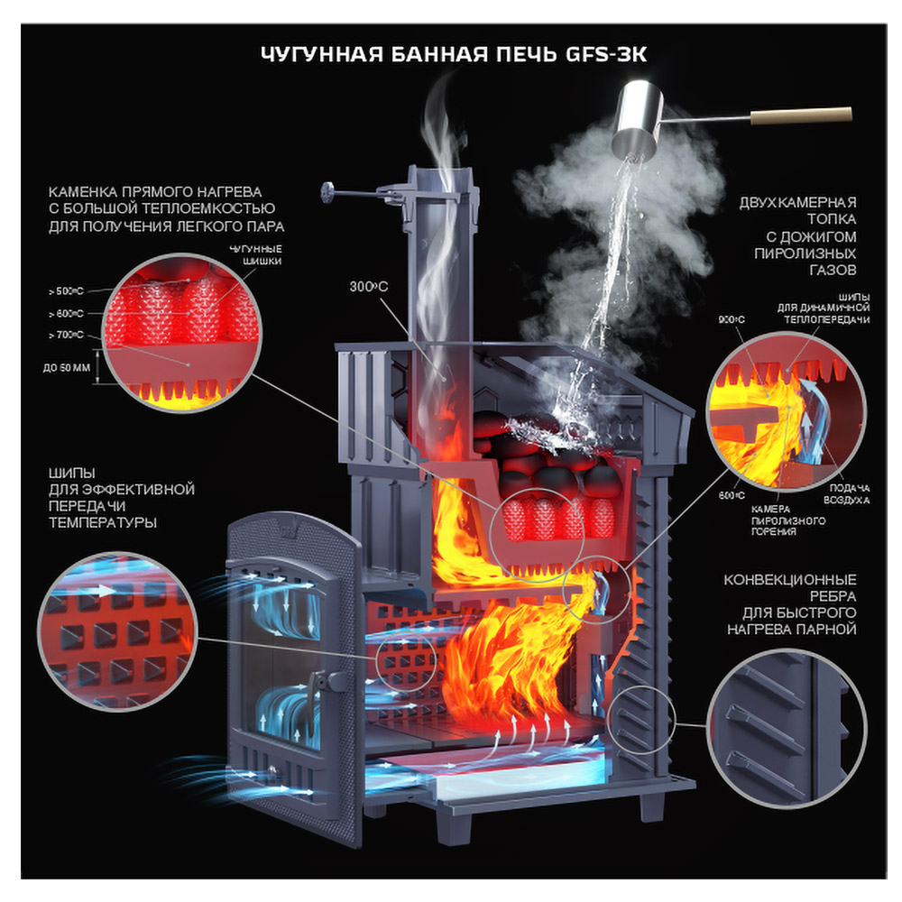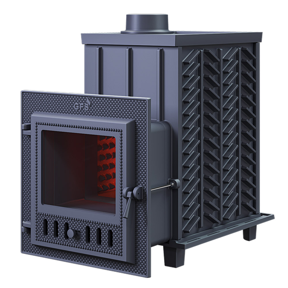 Печь для бани GFS ЗК - модель повышенной мощности и надежности для коммерческого применения. Основной принцип работы печи – получение пара с теплоёмкой каменки прямого нагрева. Каменка является сводом топки, нагревается с нижней поверхности снабженной теплосъемными шипами для увеличения контакта с пламенем. Увеличенная масса, толщина боковых стенок 14 мм повышают надежность и теплоаккумулирующую способность, а для быстрого нагрева парной боковые стенки оборудованы конвекционными ребрами не только снаружи, но и на внутренней поверхности.
