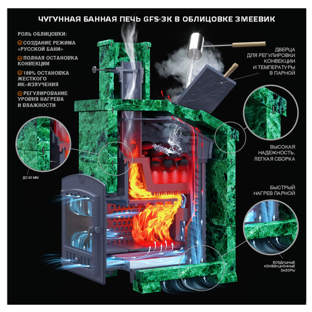 Увеличенная масса, толщина боковых стенок 14 мм повышают надежность и теплоаккумулирующую способность, а для быстрого нагрева парной боковые стенки оборудованы конвекционными ребрами не только снаружи, но и на внутренней поверхности.