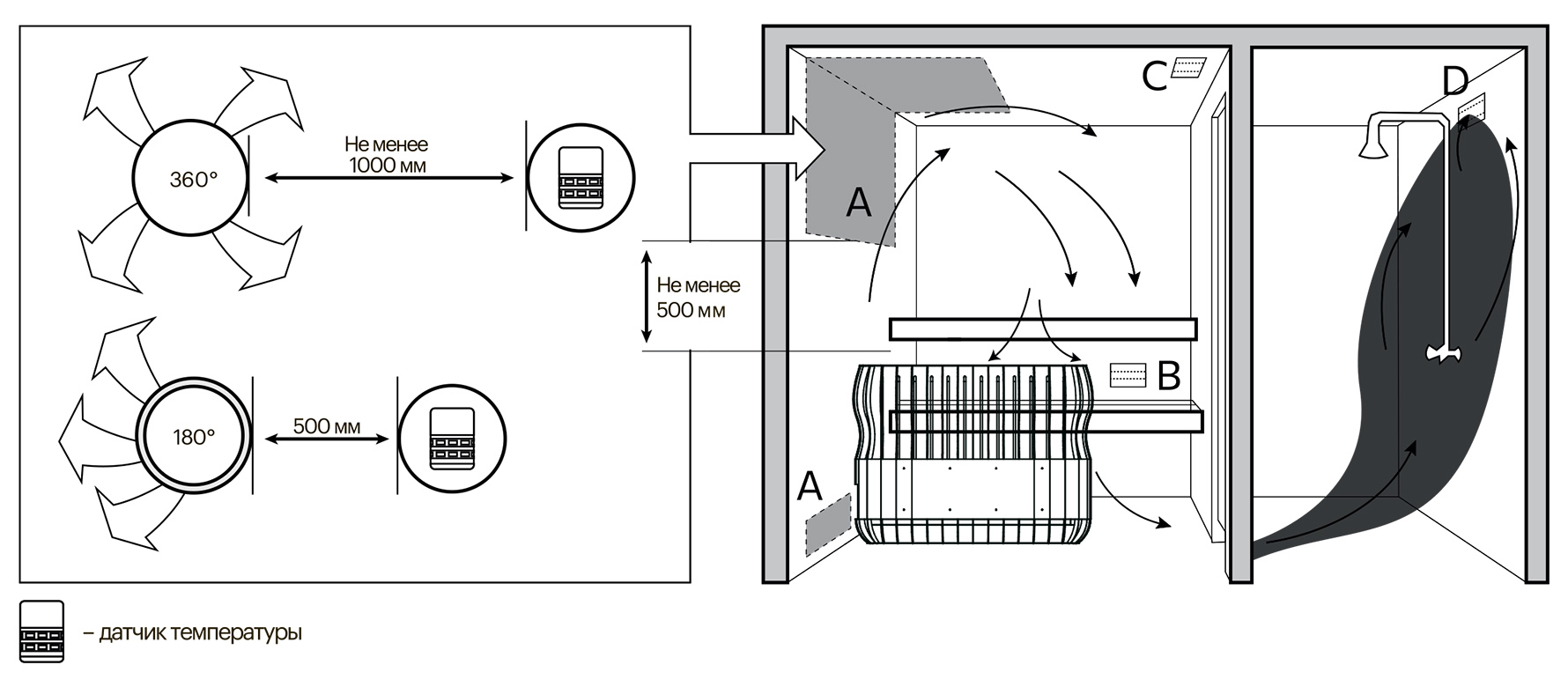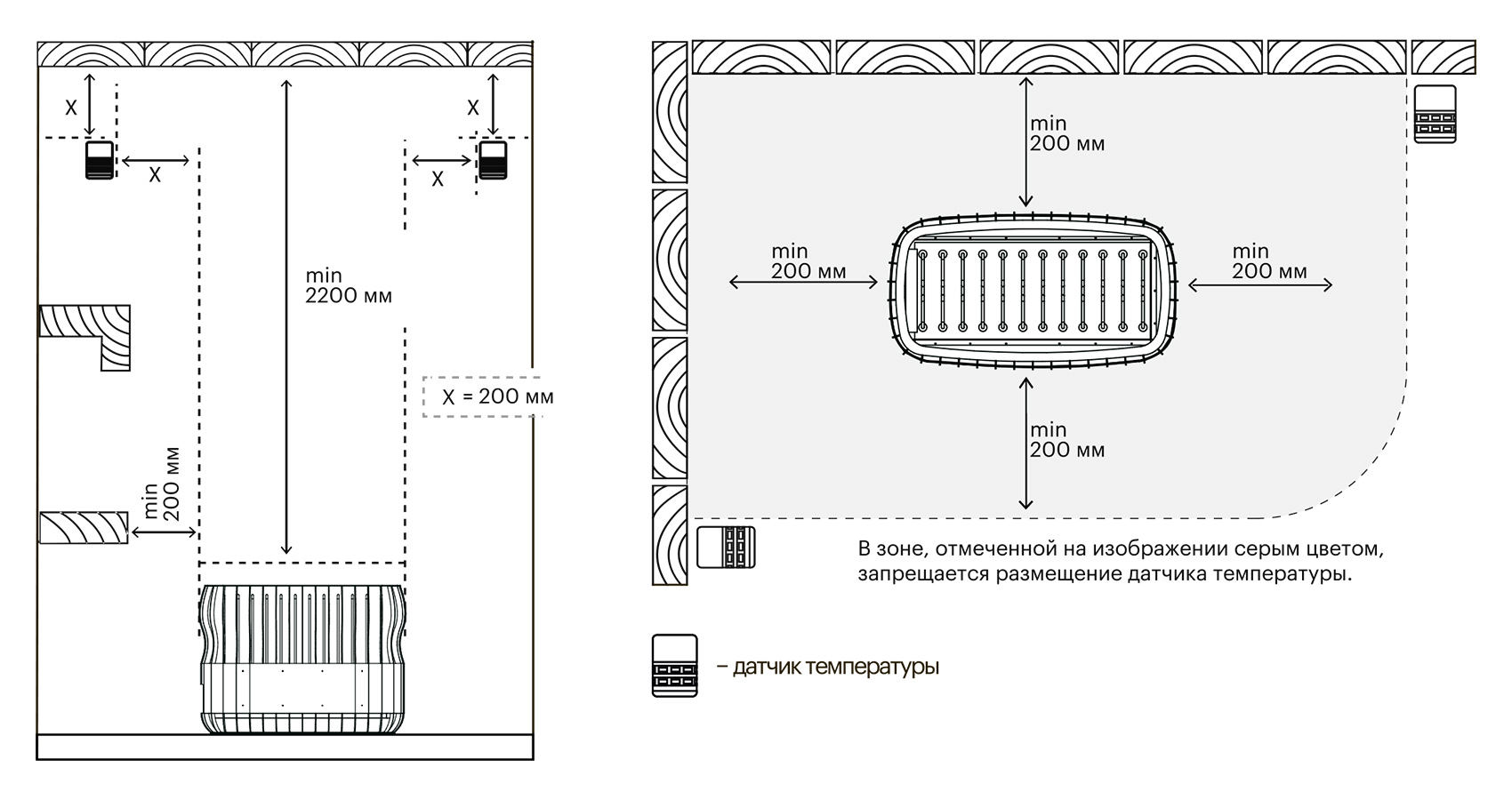* Если в стенах или потолке сауны имеются не изолированные каменные/стеклянные или подобные поверхности, каменке потребуется больше энергии. На каждый не утепленный квадратный метр площади к объему сауны добавляется 1,2 кубических метра.