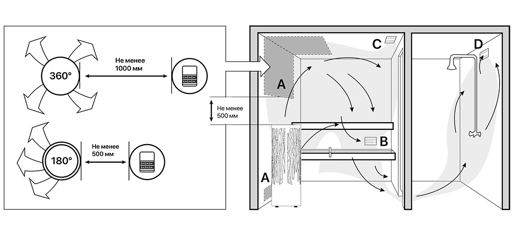 Воздух в сауне должен заменяться шесть раз в час. На схеме ниже показаны варианты вентиляции сауны