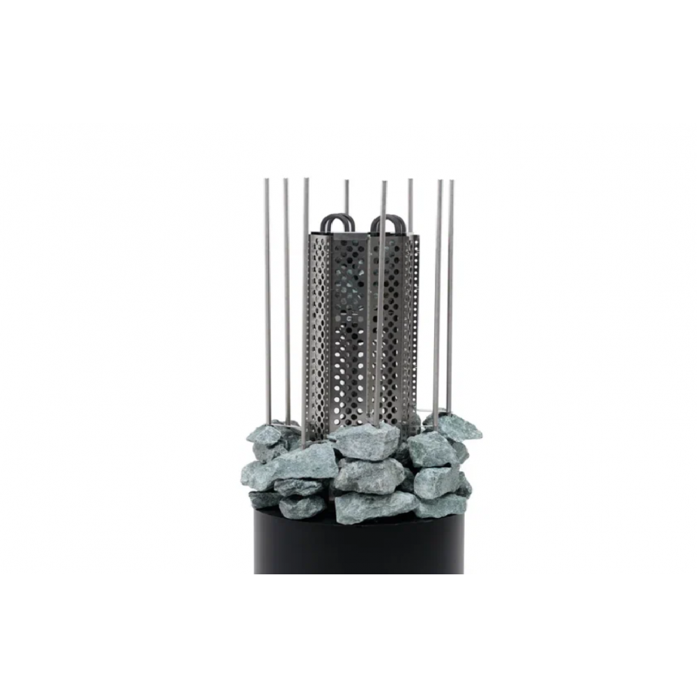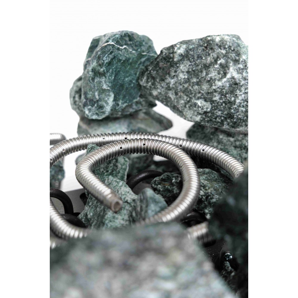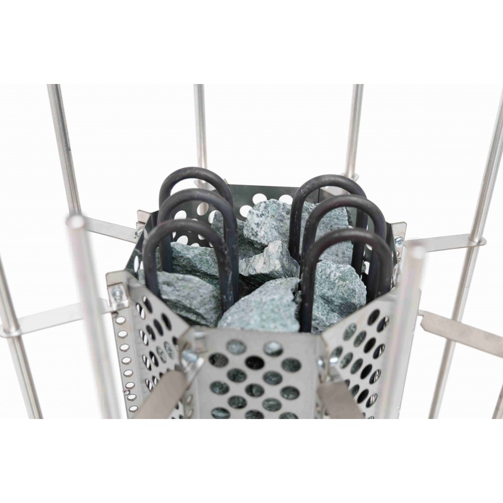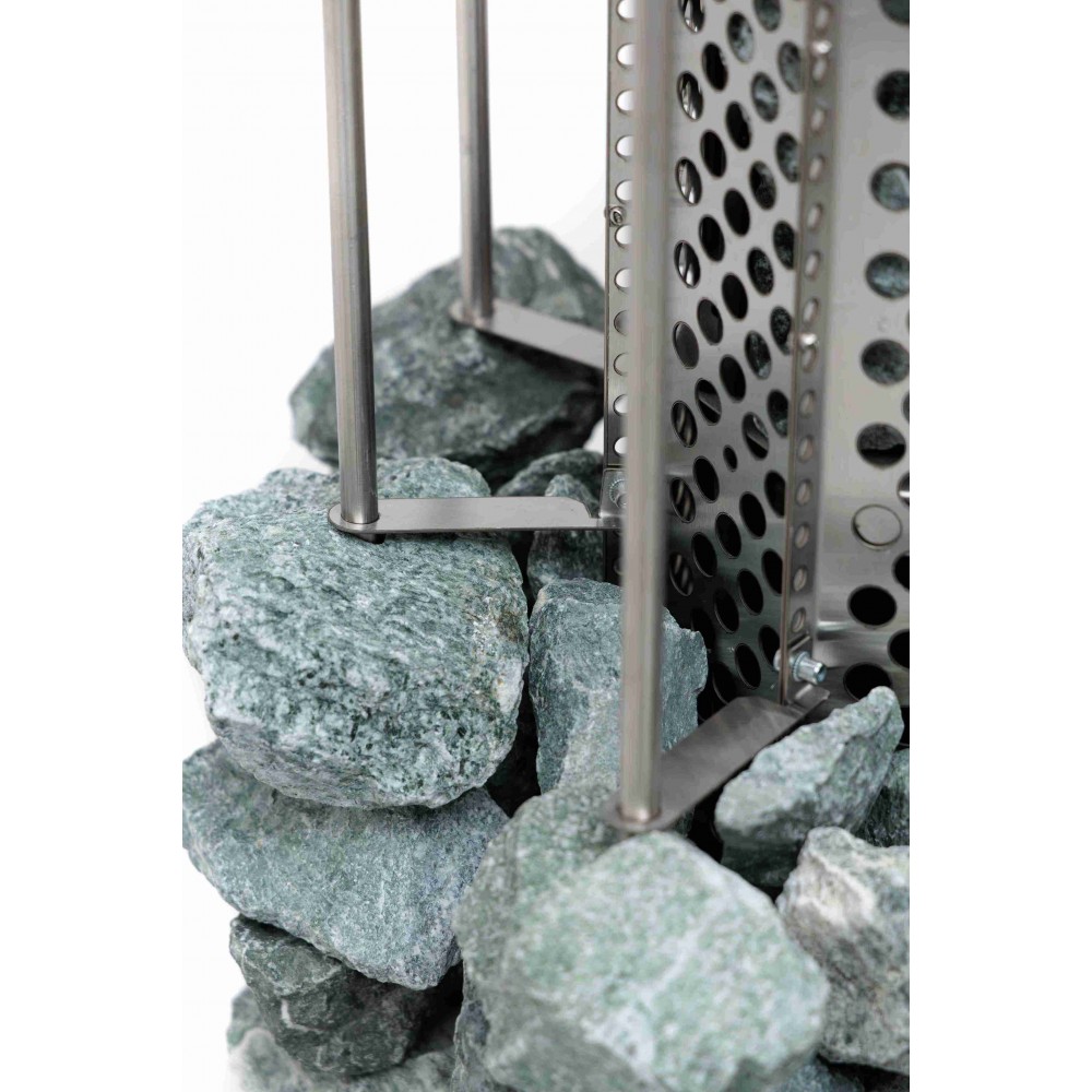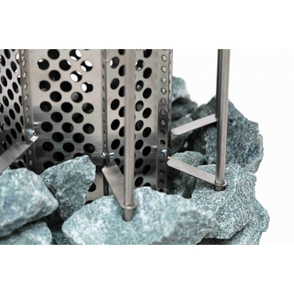 ТЭНы, защитный кожух для ТЭНов, шпильки для нанизывания камней, фиксаторы шпилек, нижняя часть – всё сделано из жаростойкой, прочной, устойчивой к коррозии нержавеющей стали AISI 304. Сегодня эта сталь считается эталоном в промышленности. Она долговечна, отлично переносит перепады температур, устойчива к негативному влиянию воды и механическим повреждениям.