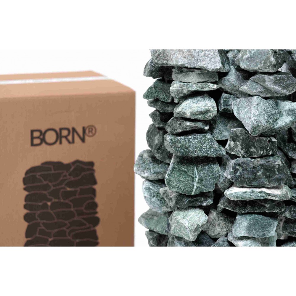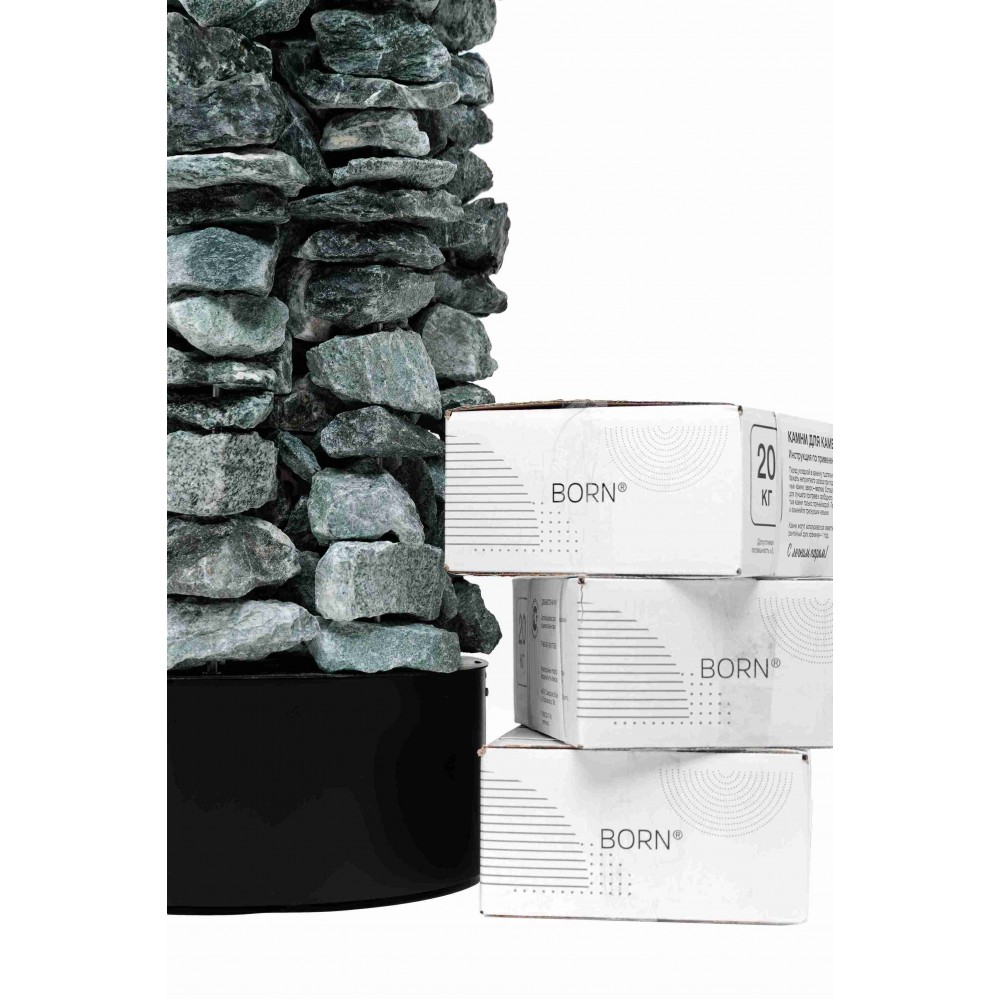 электрокаменка BORN® ROCK B100E – 1 шт.; Фиксаторы с винтами для шпилек - 24 шт.; камень жадеит облицовочный со сквозными и глухими отверстиями – 7 коробок по 20 кг (общий вес 140 кг); камень жадеит для закладки внутрь – 4 коробки по 20 кг (общий вес 80 кг); кабельный ввод из термопластика – 1 шт.; руководство по монтажу и эксплуатации – 1 шт.