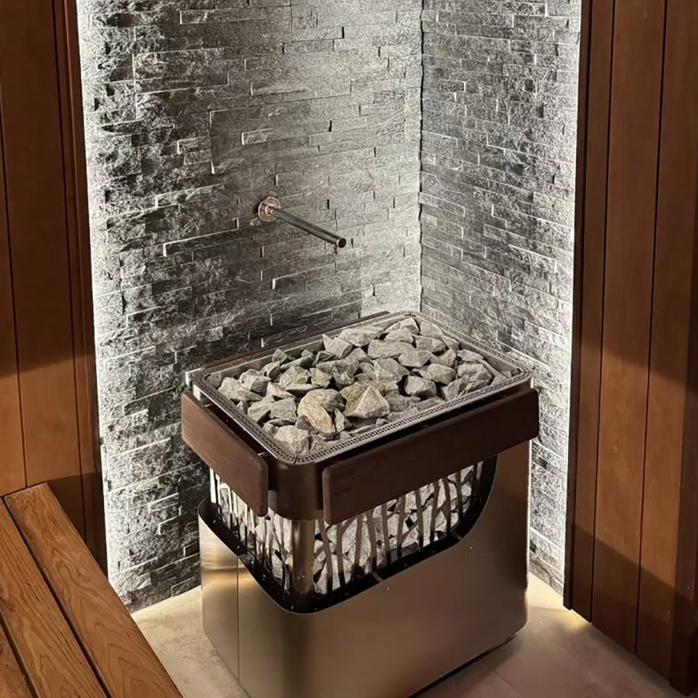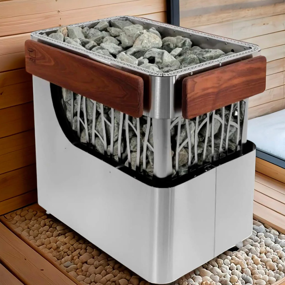 Полуоткрытый корпус, внушительная площадь испарения и большое количество камней, размещаемых в каменке stone и прогреваемых от жара ТЭНов, равномерно прогревают сауну.
