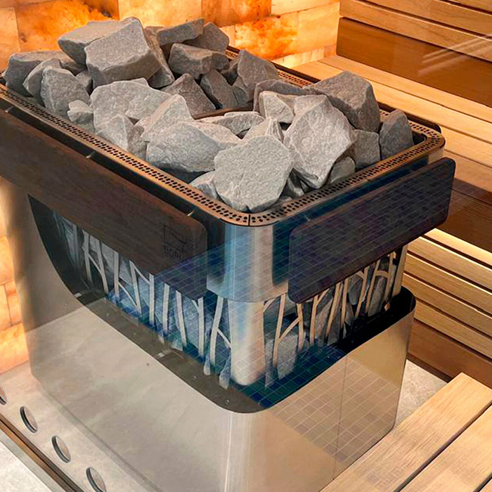 Корпус с двойной стенкой. Комбинированные стенки корпуса выполнены в виде решетки из нержавеющей стали AISI 304, за которой видны камни и декоративные накладки из термоясеня. Опционально можно установить систему подачи пара для создания мелкодисперсного, не обжигающего пара, осуществляя терапевтический эффект.