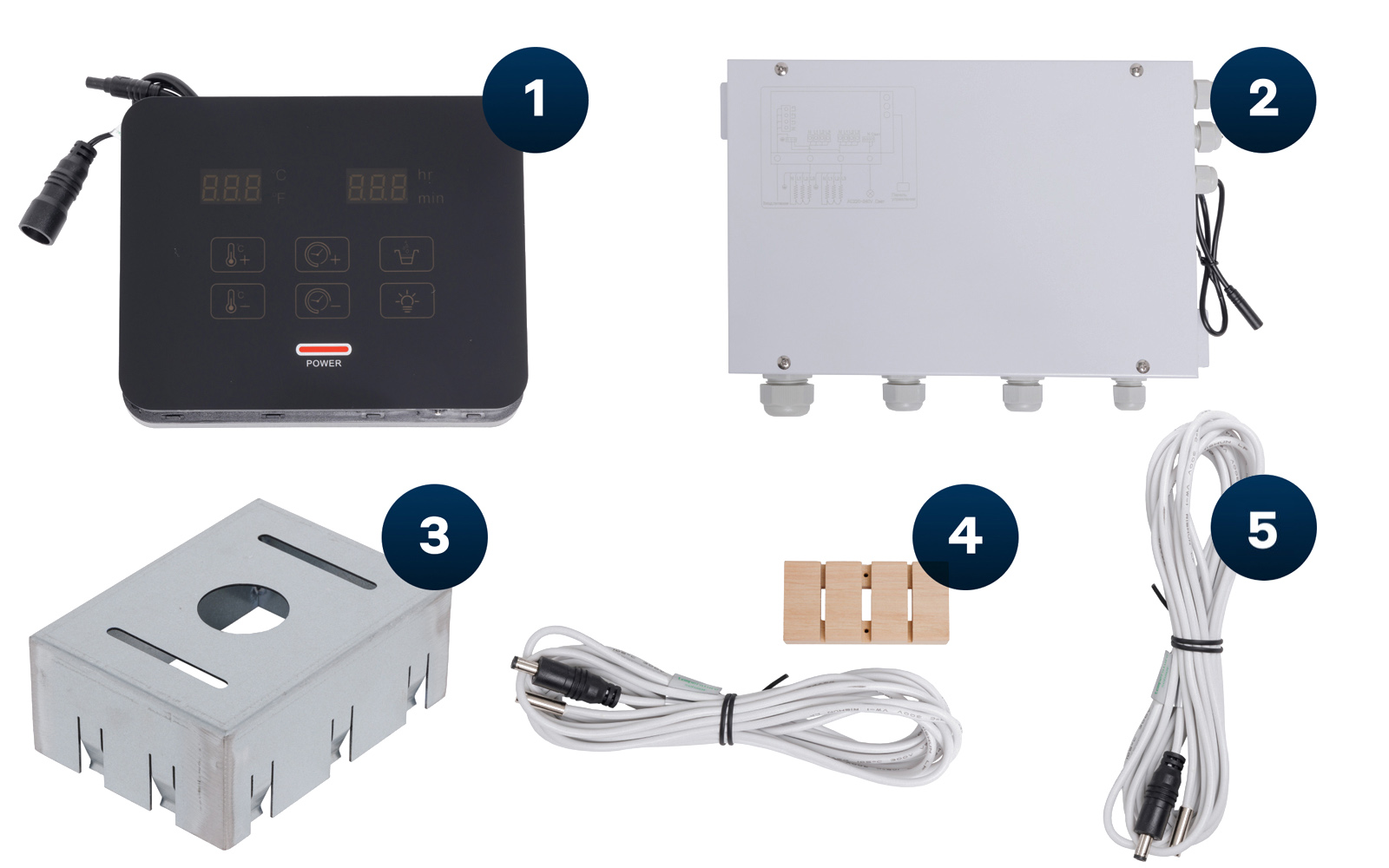 Система датчиков: 1) цифровой датчик температуры в парной; 2) датчик ограничителя перегрева 125°C.
