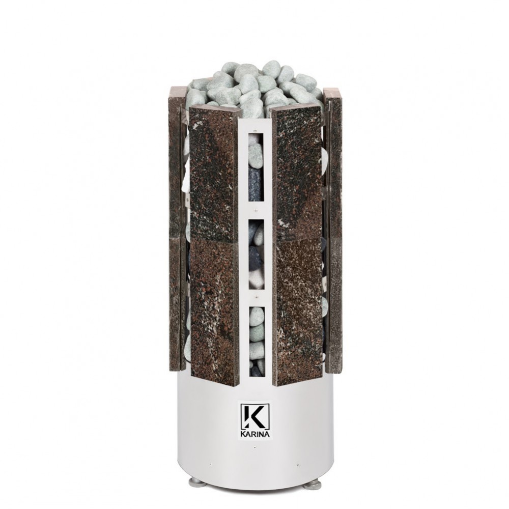 Электрокаменка Karina Forta 6 Амфиболит предназначена для использования в парных объемом от 6 до 8 м³. Печь выполнена в напольном варианте и обладает цилиндрической формой дополненной плитами из натурального камня Амфиболита. Общий вес камней составляет 160 кг (загрузка печи 100 кг и вес облицовки 60 кг). Вес камней сопоставим с закладкой в хорошую дровяную печь, тем самым с помощью парогенератора, закрытой каменки и закладки камня в 100 кг, легко достигается режим настоящей русской бани.