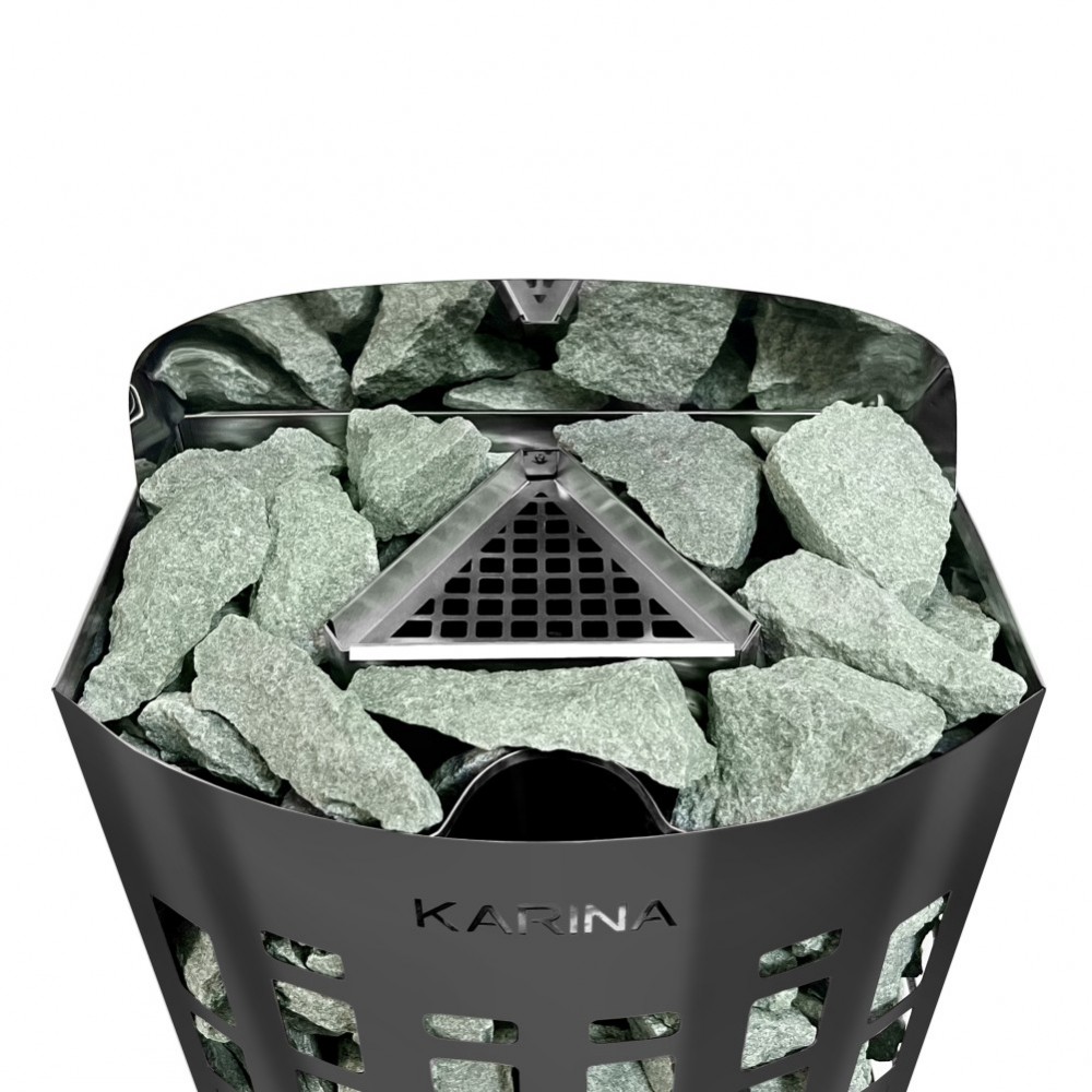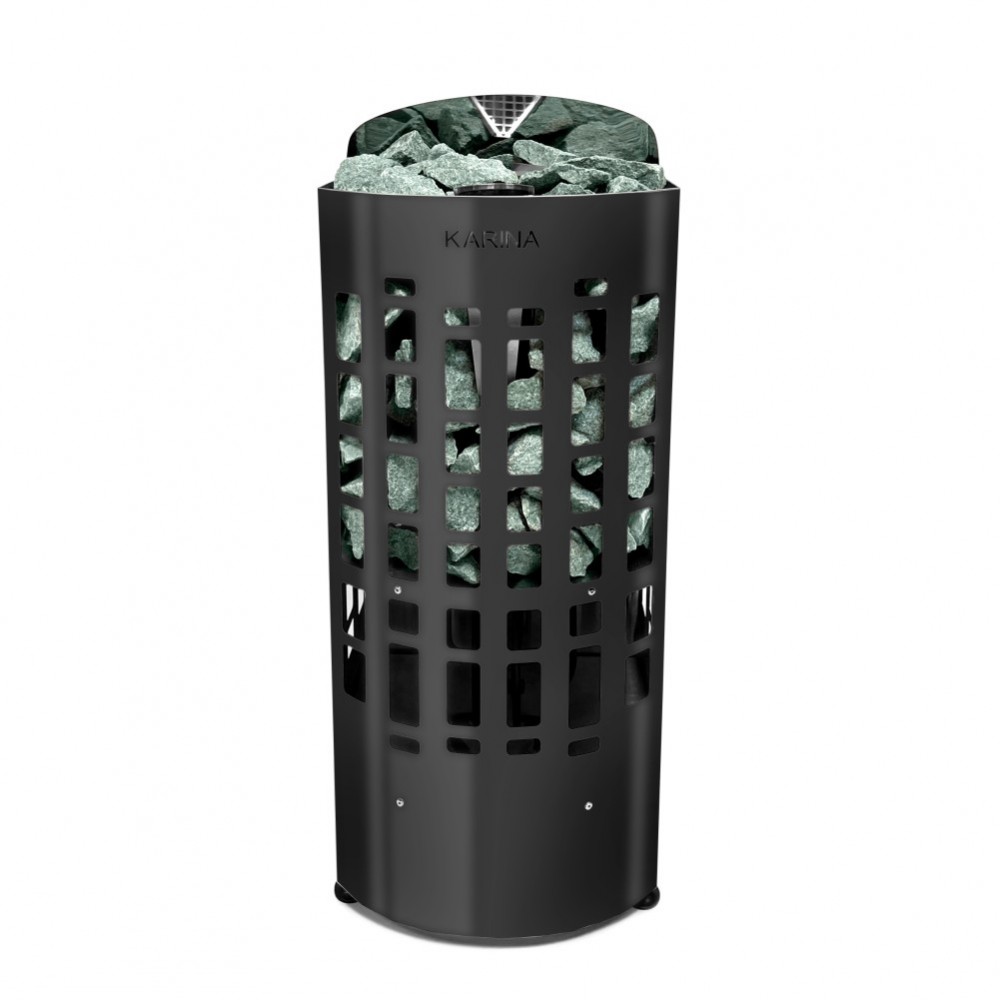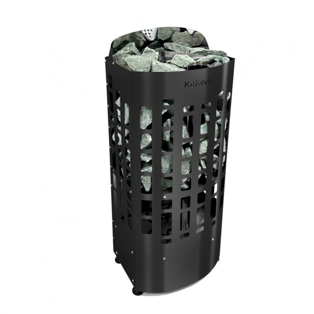 Электрокаменка Karina Nika 6E предназначена для использования в парных объемом от 6 до 8 м³. Печь выполнена в напольном варианте цилиндрической формы. Дизайн печи современный и элегантный, доступен в черном и серебристом цветах, что позволяет гармонично вписать ее в любой интерьер сауны (см. фото). Вес загружаемых камней составляет 60 кг, что сопоставимо с загрузкой камней в хорошей дровяной печи.