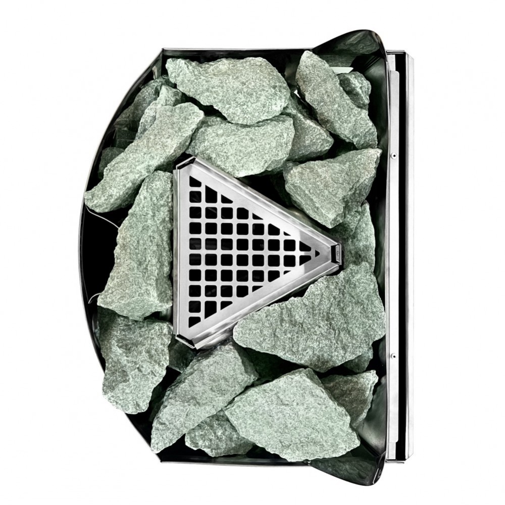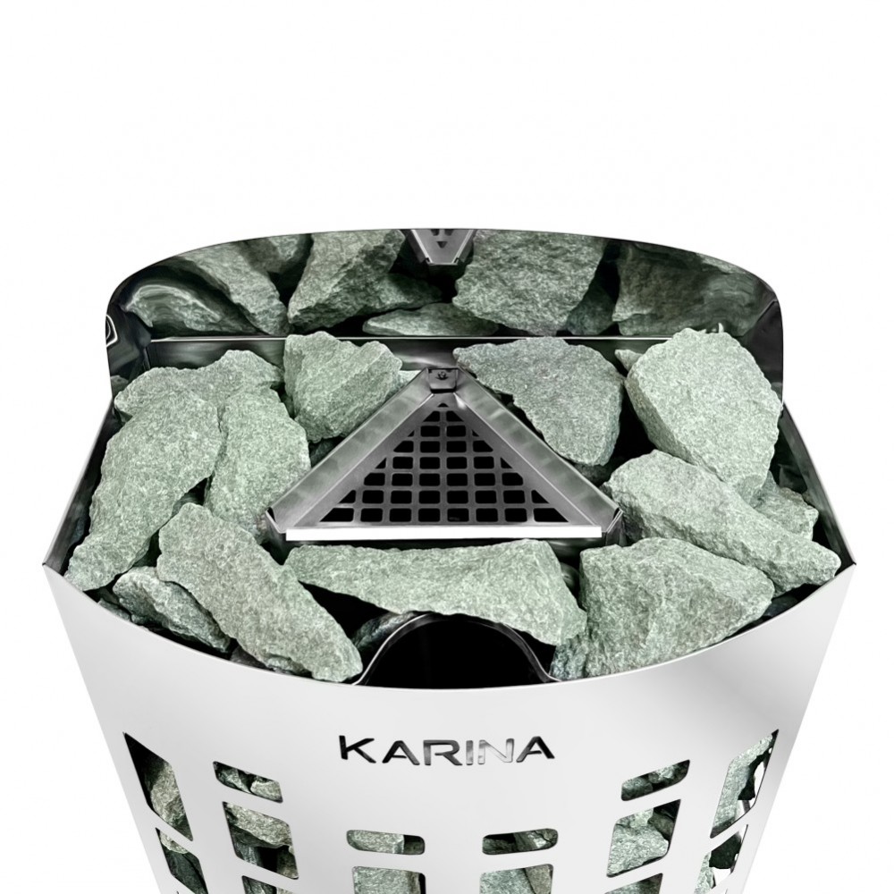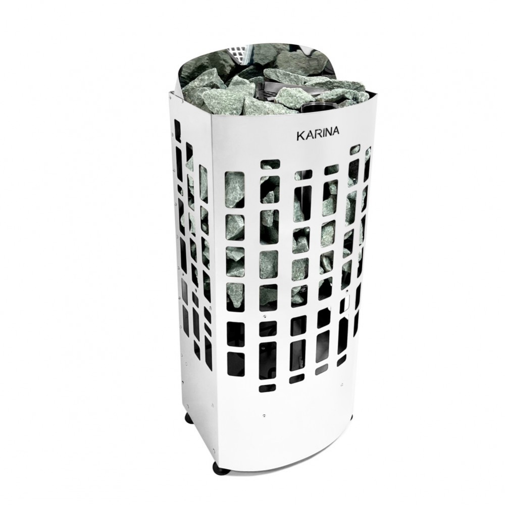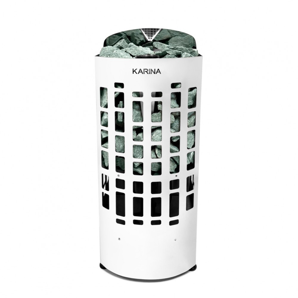 Электрокаменка Karina Nika 6E предназначена для использования в парных объемом от 6 до 8 м³. Печь выполнена в напольном варианте цилиндрической формы. Дизайн печи современный и элегантный, доступен в черном и серебристом цветах, что позволяет гармонично вписать ее в любой интерьер сауны (см. фото). Вес загружаемых камней составляет 60 кг, что сопоставимо с загрузкой камней в хорошей дровяной печи.