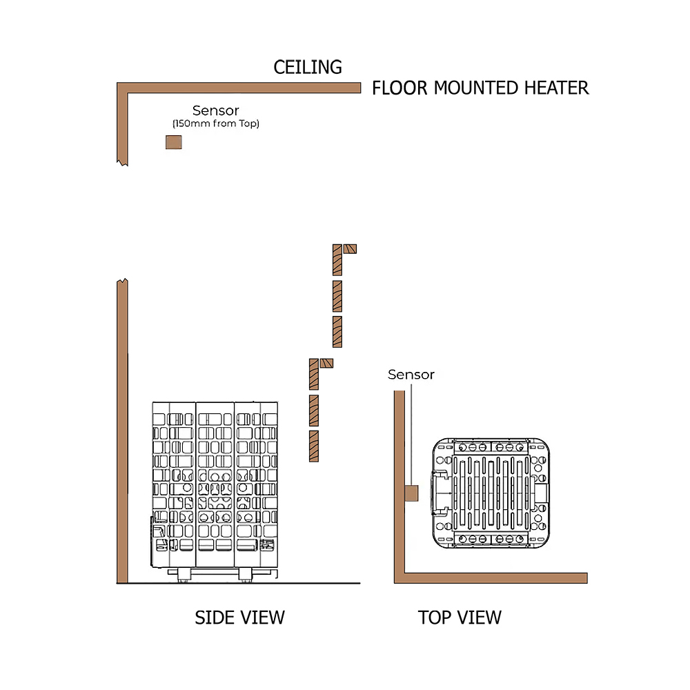 Расположите датчик над нагревателем. (см. рис.). Не размещайте датчики вблизи вентиляционных отверстий. Из-за закрытости вентиляционных отверстий датчик охлаждается. Таким образом, на дисплее отображается неверная температура, и нагреватель может перегреться.