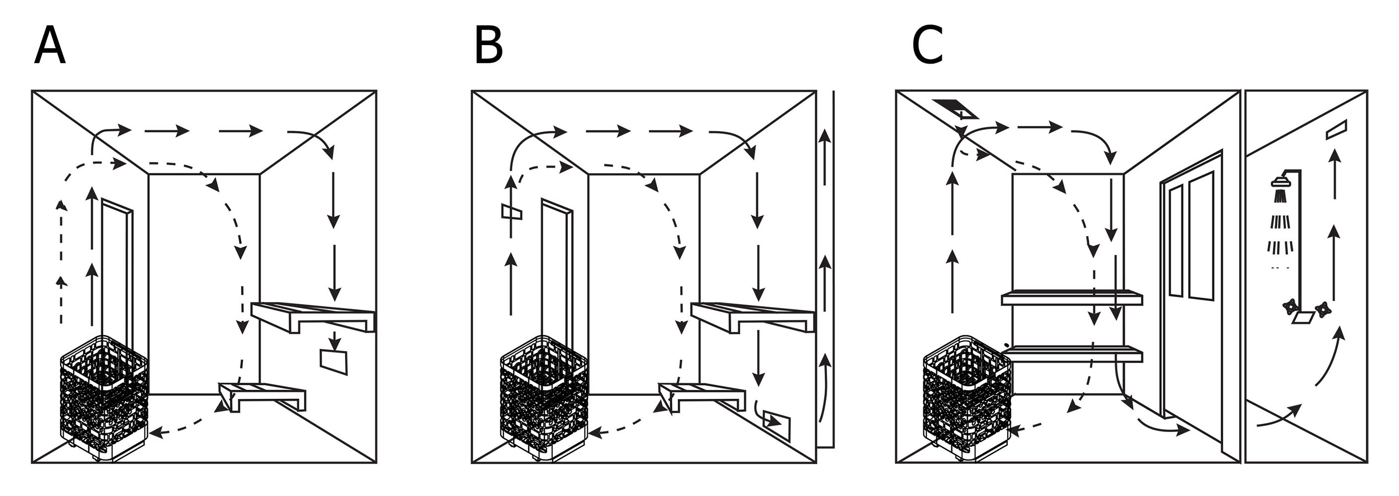 Расположение входных и выходных вентиляционных отверстий может варьироваться в зависимости от конструкции помещения сауны или предпочтений владельца. Входное вентиляционное отверстие может быть установлено на стене непосредственно под каменкой (рис. А). При использовании механической вентиляции входное вентиляционное отверстие может располагаться на расстоянии не менее 60 см над обогревателем (рис. Б) или на потолок над каменкой (рис. В). При таком расположении тяжелый холодный воздух, поступающий в сауну, смешивается с легким горячим воздухом, поступающим из каменки, что позволяет банщикам дышать свежим воздухом. Диаметр входного и выходного отверстий должен составлять 10 см.