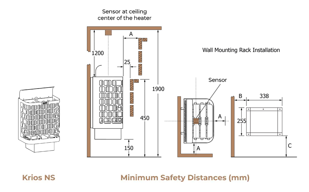 Расположите датчик над нагревателем. (см. рис.). Не размещайте датчики вблизи вентиляционных отверстий. Из-за закрытости вентиляционных отверстий датчик охлаждается. Таким образом, на дисплее отображается неверная температура, и нагреватель может перегреться.