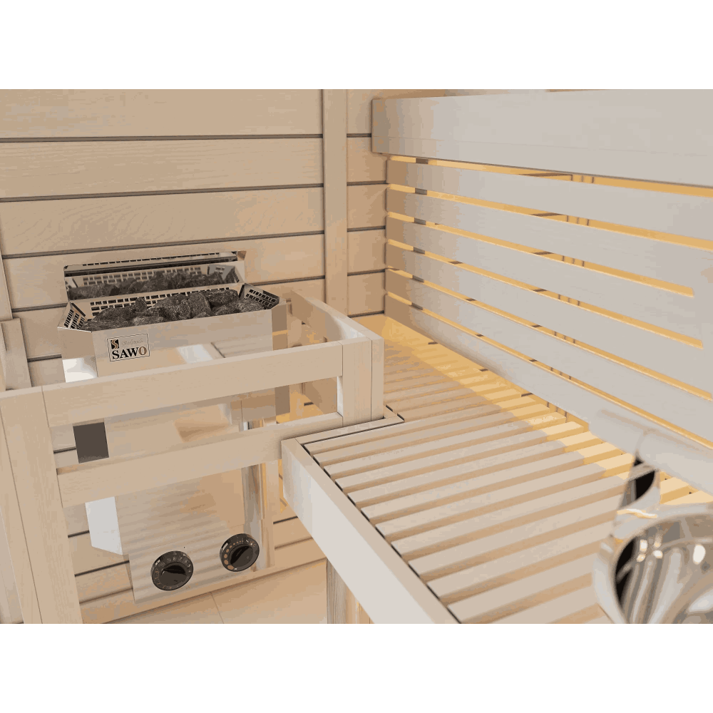 Камни и пар: Вместимость для камней — до 10 кг ( рекомендуется жадеит, малиновый кварцит, не входящие в комплект). Печь поддерживает традиционный финский пар: просто поливайте камни водой для мягкого и ароматного пара.