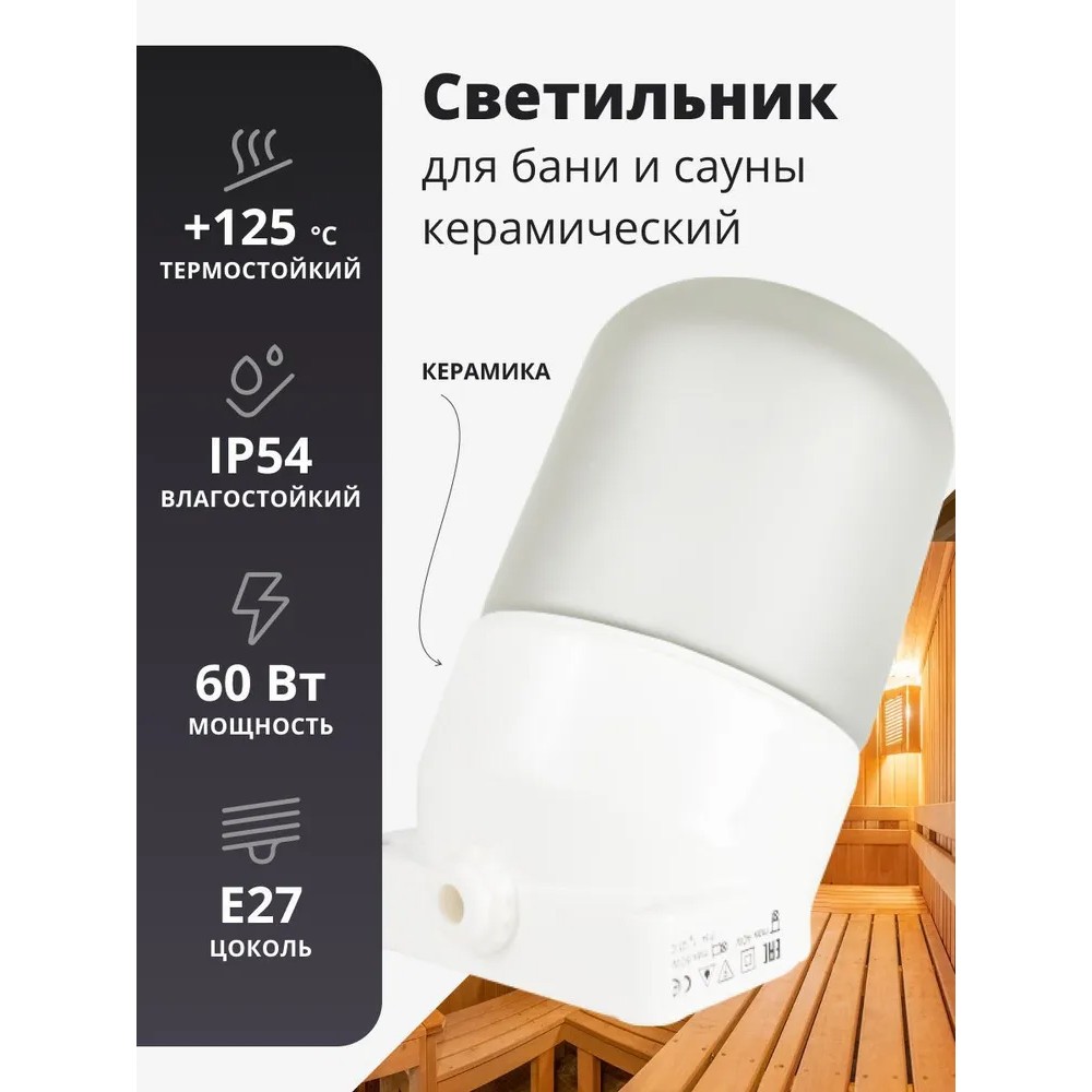Корпус изготовлен из керамики, материал плафона - силикатное термостойкое стекло матового цвета. Между корпусом и плафоном светильника установлено термостойкое силиконовое уплотнение для защиты от проникновения влажного пара, брызг воды и пыли.